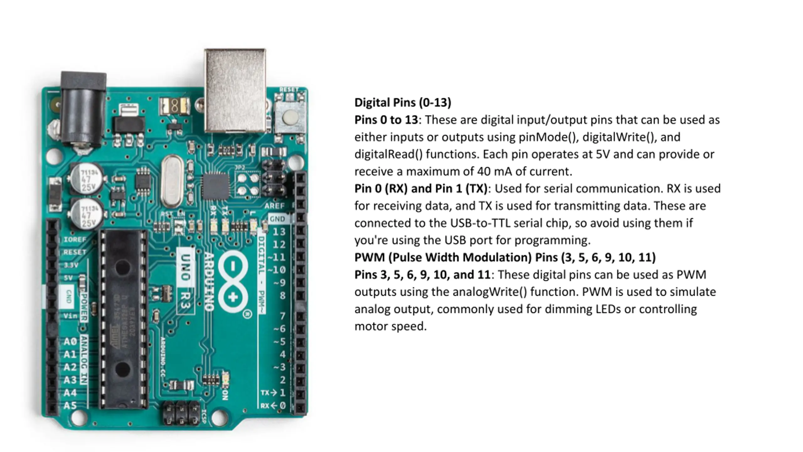 Digital Pins (0-13) Pins 0 to 13: These are digital input/output pins that can be used as either inputs or outputs using pinMode(), digitalWrite(), and digitalRead() functions. Each pin operates at 5V and can provide or receive a maximum of 40 mA of current. Pin 0 (RX) and Pin 1 (TX): Used for serial communication. RX is used for receiving data, and TX is used for transmitting data. These are connected to the USB-to-TTL serial chip, so avoid using them if you're using the USB port for programming. PWM (Pulse Width Modulation) Pins (3, 5, 6, 9, 10, 11) Pins 3, 5, 6, 9, 10, and 11: These digital pins can be used as PWM outputs using the analogWrite() function. PWM is used to simulate analog output, commonly used for dimming LEDs or controlling motor speed.