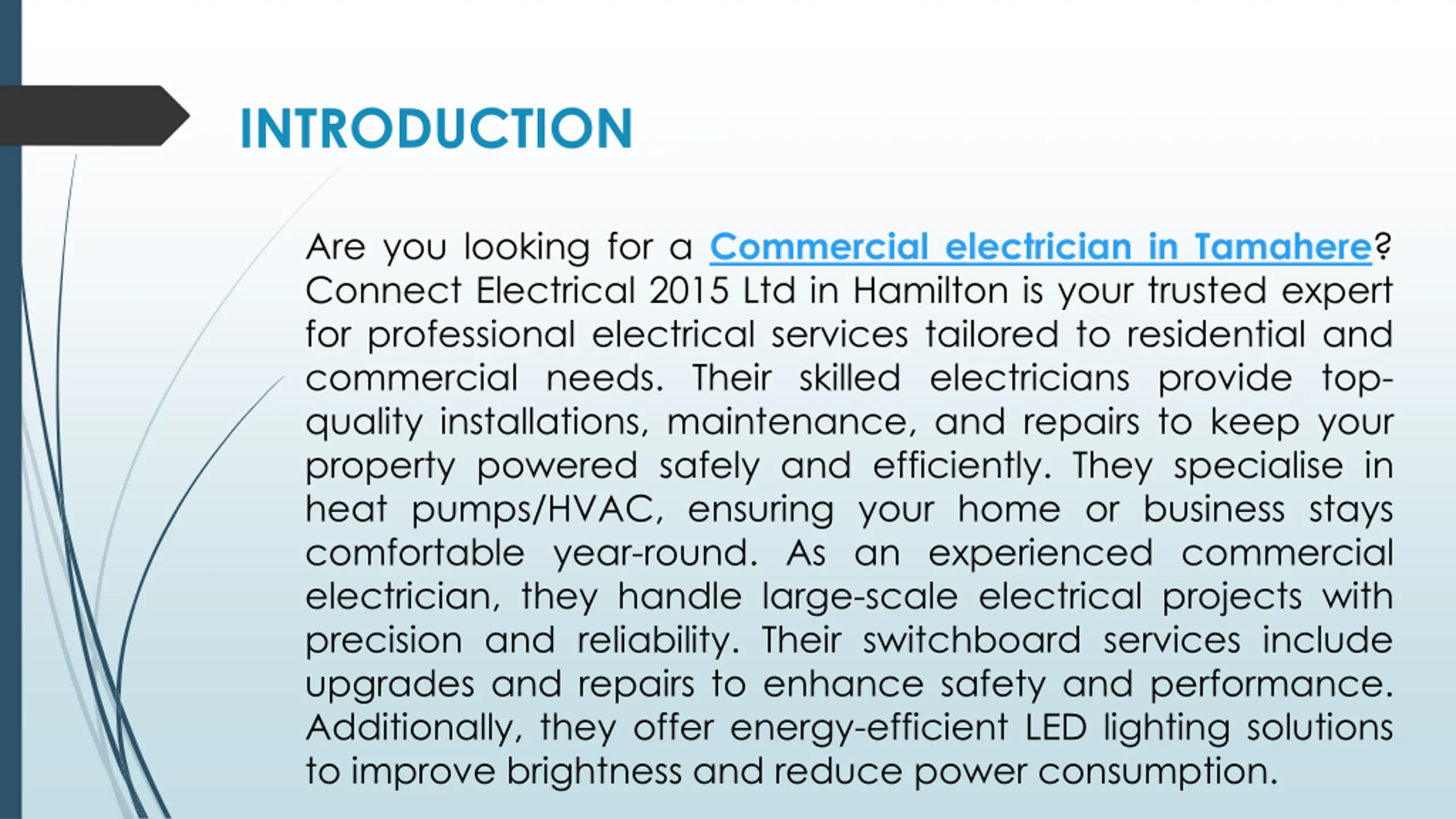 INTRODUCTION Are you looking for a Commercial electrician in Tamahere? Connect Electrical 2015 Ltd in Hamilton is your trusted expert for professional electrical services tailored to residential and commercial needs. Their skilled electricians provide top- quality installations, maintenance, and repairs to keep your property powered safely and efficiently. They specialise in heat pumps/HVAC, ensuring your home or business stays comfortable year-round. As an experienced commercial electrician, they handle large-scale electrical projects with precision and reliability. Their switchboard services include upgrades and repairs to enhance safety and performance. Additionally, they offer energy-efficient LED lighting solutions to improve brightness and reduce power consumption.