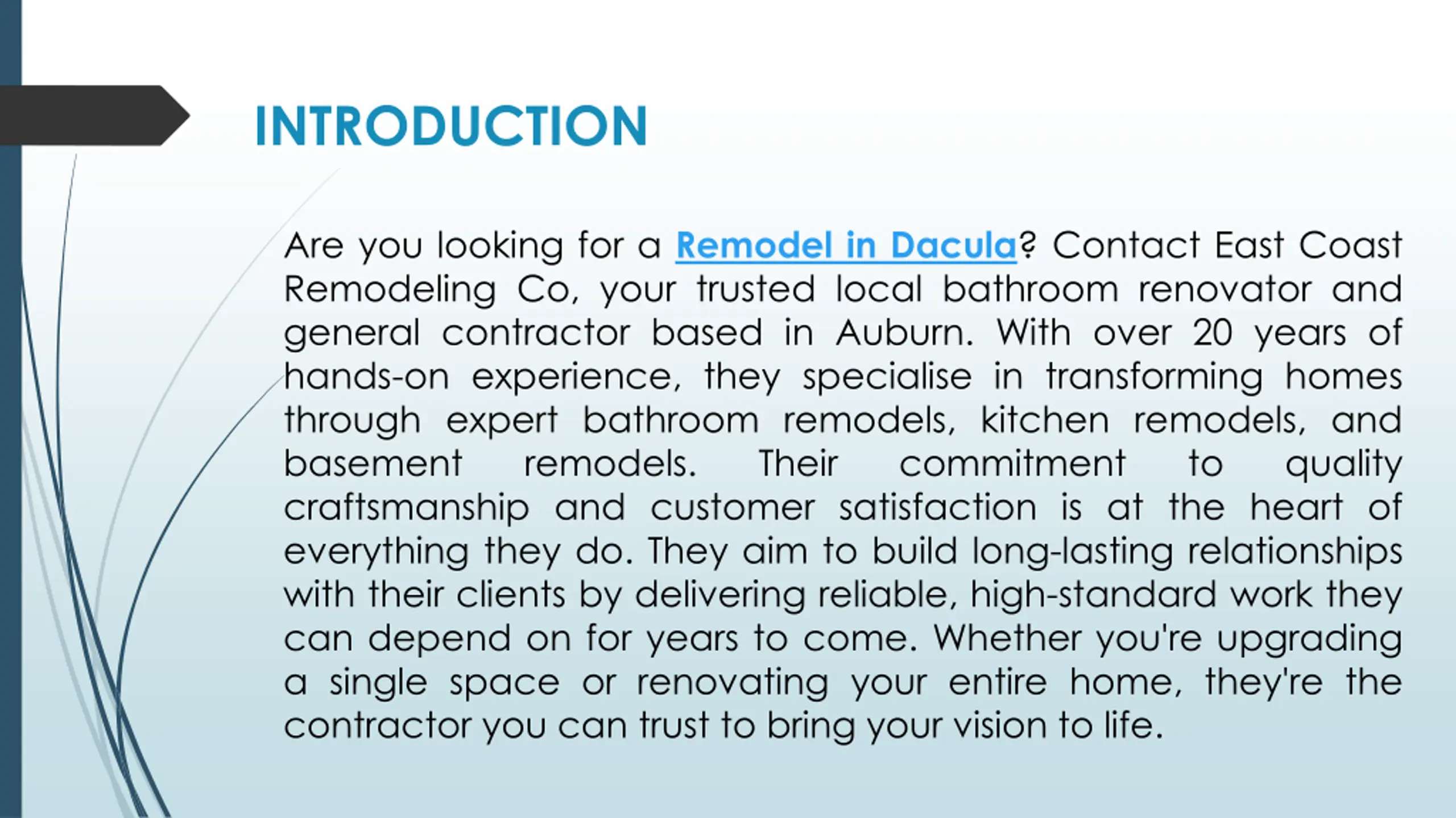 INTRODUCTION Are you looking for a Remodel in Dacula? Contact East Coast Remodeling Co, your trusted local bathroom renovator and general contractor based in Auburn. With over 20 years of hands-on experience, they specialise in transforming homes through expert bathroom remodels, kitchen remodels, and basement remodels. Their craftsmanship and customer satisfaction is at the heart of everything they do. They aim to build long-lasting relationships with their clients by delivering reliable, high-standard work they can depend on for years to come. Whether you're upgrading a single space or renovating your entire home, they're the contractor you can trust to bring your vision to life. commitment to quality