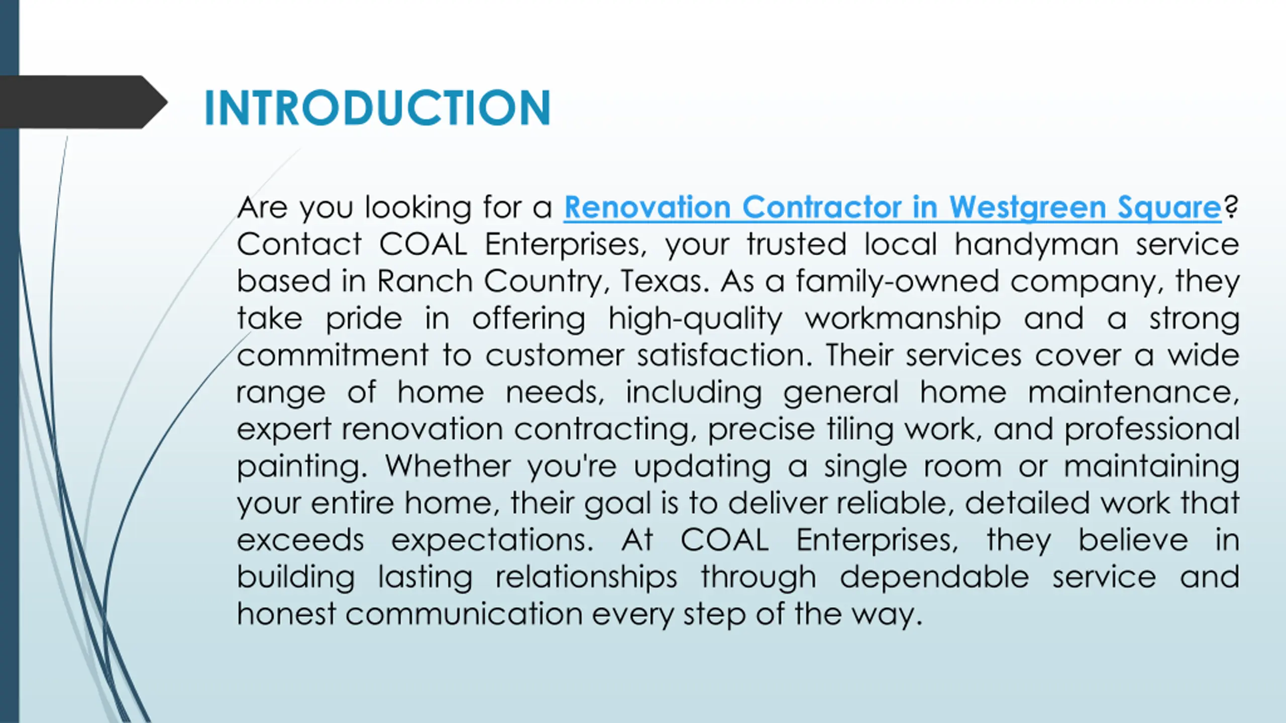 INTRODUCTION Are you looking for a Renovation Contractor in Westgreen Square? Contact COAL Enterprises, your trusted local handyman service based in Ranch Country, Texas. As a family-owned company, they take pride in offering high-quality workmanship and a strong commitment to customer satisfaction. Their services cover a wide range of home needs, including general home maintenance, expert renovation contracting, precise tiling work, and professional painting. Whether you're updating a single room or maintaining your entire home, their goal is to deliver reliable, detailed work that exceeds expectations. At COAL Enterprises, they believe in building lasting relationships through dependable service and honest communication every step of the way. Are you looking for a Renovation Contractor in Westgreen Square? Contact COAL Enterprises, your trusted local handyman service based in Ranch Country, Texas. As a family-owned company, they take pride in offering high-quality workmanship and a strong commitment to customer satisfaction. Their services cover a wide range of home needs, including general home maintenance, expert renovation contracting, precise tiling work, and professional painting. Whether you're updating a single room or maintaining your entire home, their goal is to deliver reliable, detailed work that exceeds expectations. At COAL Enterprises, they believe in building lasting relationships through dependable service and honest communication every step of the way.