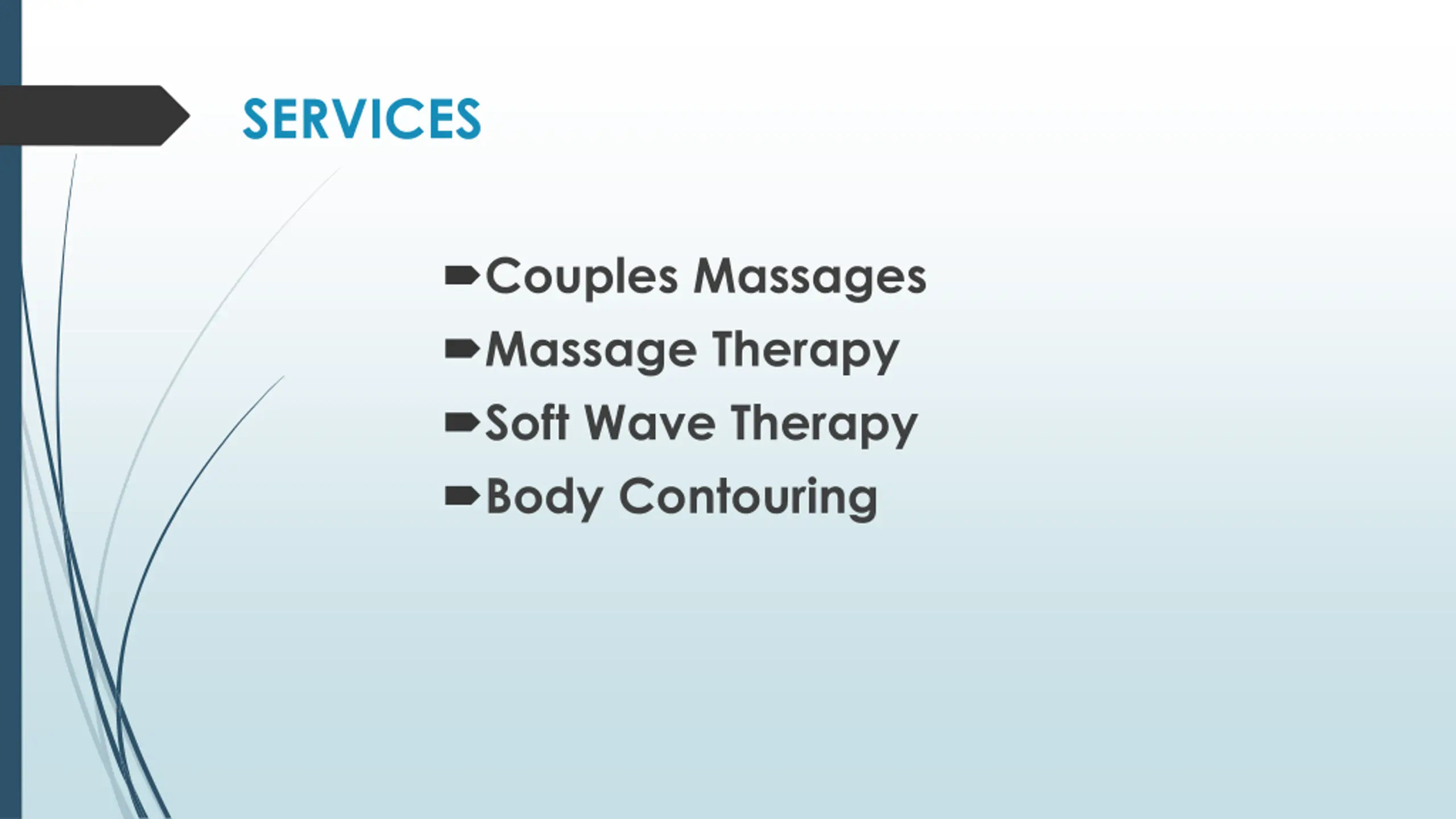 SERVICES Couples Massages Massage Therapy Soft Wave Therapy Body Contouring