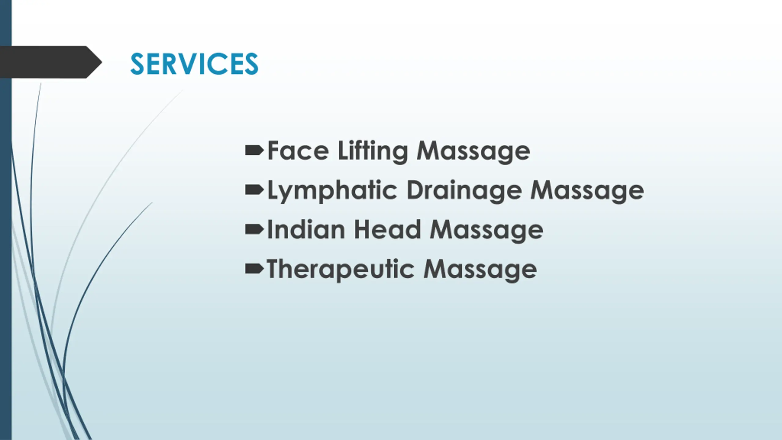 SERVICES Face Lifting Massage Lymphatic Drainage Massage Indian Head Massage Therapeutic Massage