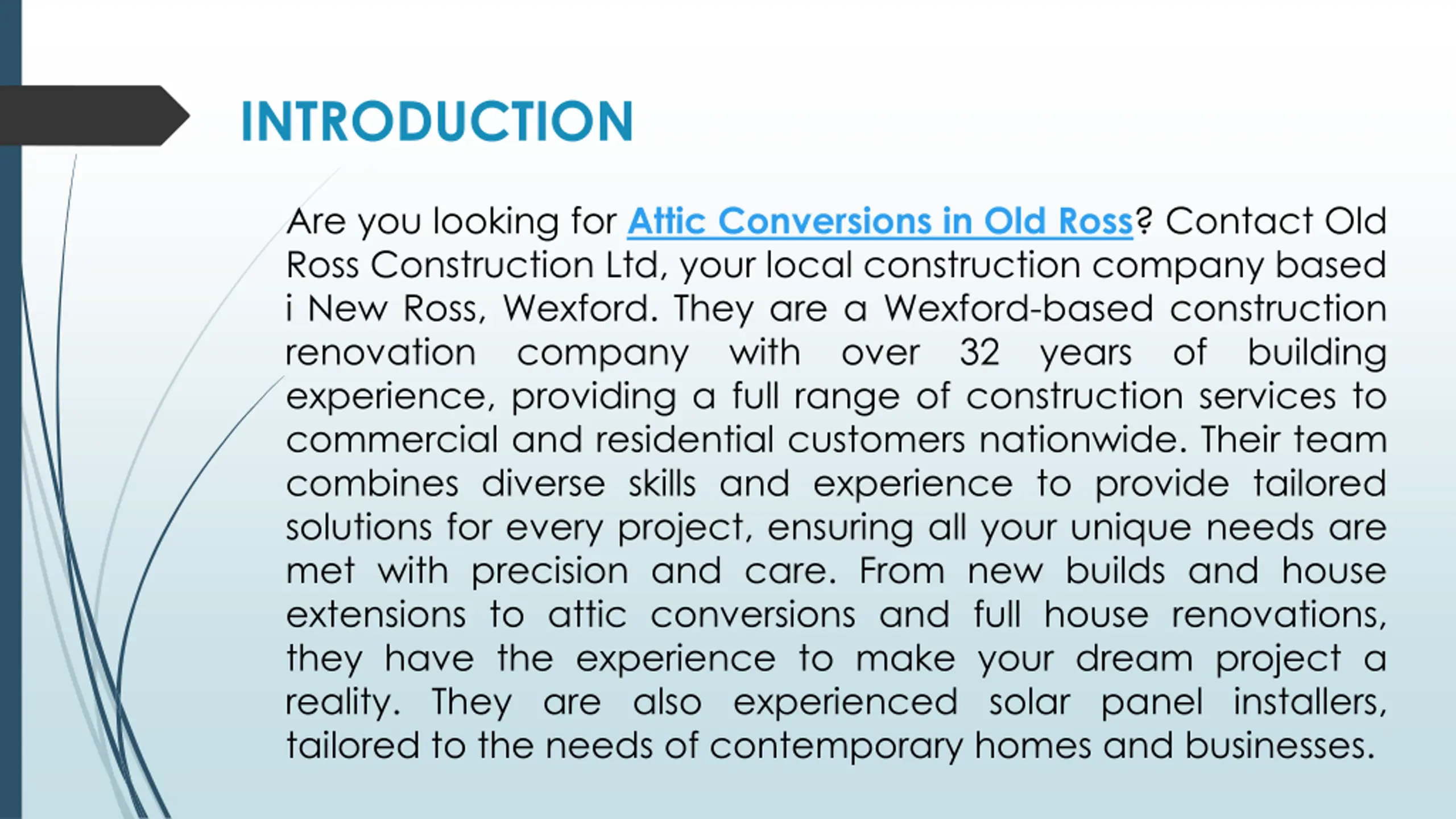 INTRODUCTION Are you looking for Attic Conversions in Old Ross? Contact Old Ross Construction Ltd, your local construction company based i New Ross, Wexford. They are a Wexford-based construction renovation company with over 32 years of building experience, providing a full range of construction services to commercial and residential customers nationwide. Their team combines diverse skills and experience to provide tailored solutions for every project, ensuring all your unique needs are met with precision and care. From new builds and house extensions to attic conversions and full house renovations, they have the experience to make your dream project a reality. They are also experienced solar panel installers, tailored to the needs of contemporary homes and businesses. Are you looking for Attic Conversions in Old Ross? Contact Old Ross Construction Ltd, your local construction company based i New Ross, Wexford. They are a Wexford-based construction renovation company with over 32 years of building experience, providing a full range of construction services to commercial and residential customers nationwide. Their team combines diverse skills and experience to provide tailored solutions for every project, ensuring all your unique needs are met with precision and care. From new builds and house extensions to attic conversions and full house renovations, they have the experience to make your dream project a reality. They are also experienced solar panel installers, tailored to the needs of contemporary homes and businesses.