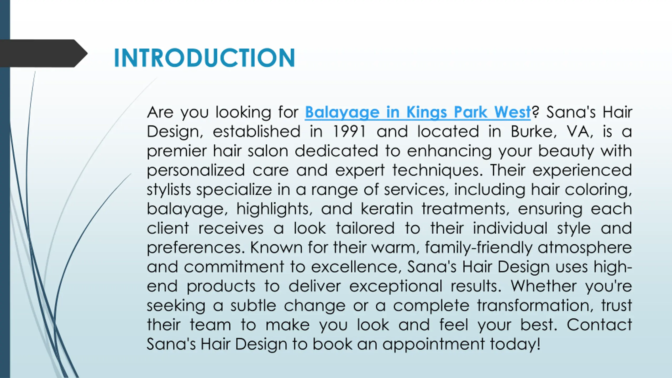 INTRODUCTION Are you looking for Balayage in Kings Park West? Sana's Hair Design, established in 1991 and located in Burke, VA, is a premier hair salon dedicated to enhancing your beauty with personalized care and expert techniques. Their experienced stylists specialize in a range of services, including hair coloring, balayage, highlights, and keratin treatments, ensuring each client receives a look tailored to their individual style and preferences. Known for their warm, family-friendly atmosphere and commitment to excellence, Sana's Hair Design uses high-end products to deliver exceptional results. Whether you're seeking a subtle change or a complete transformation, trust their team to make you look and feel your best. Contact Sana's Hair Design to book an appointment today! Are you looking for Balayage in Kings Park West? Sana's Hair Design, established in 1991 and located in Burke, VA, is a premier hair salon dedicated to enhancing your beauty with personalized care and expert techniques. Their experienced stylists specialize in a range of services, including hair coloring, balayage, highlights, and keratin treatments, ensuring each client receives a look tailored to their individual style and preferences. Known for their warm, family-friendly atmosphere and commitment to excellence, Sana's Hair Design uses high- end products to deliver exceptional results. Whether you're seeking a subtle change or a complete transformation, trust their team to make you look and feel your best. Contact Sana's Hair Design to book an appointment today!