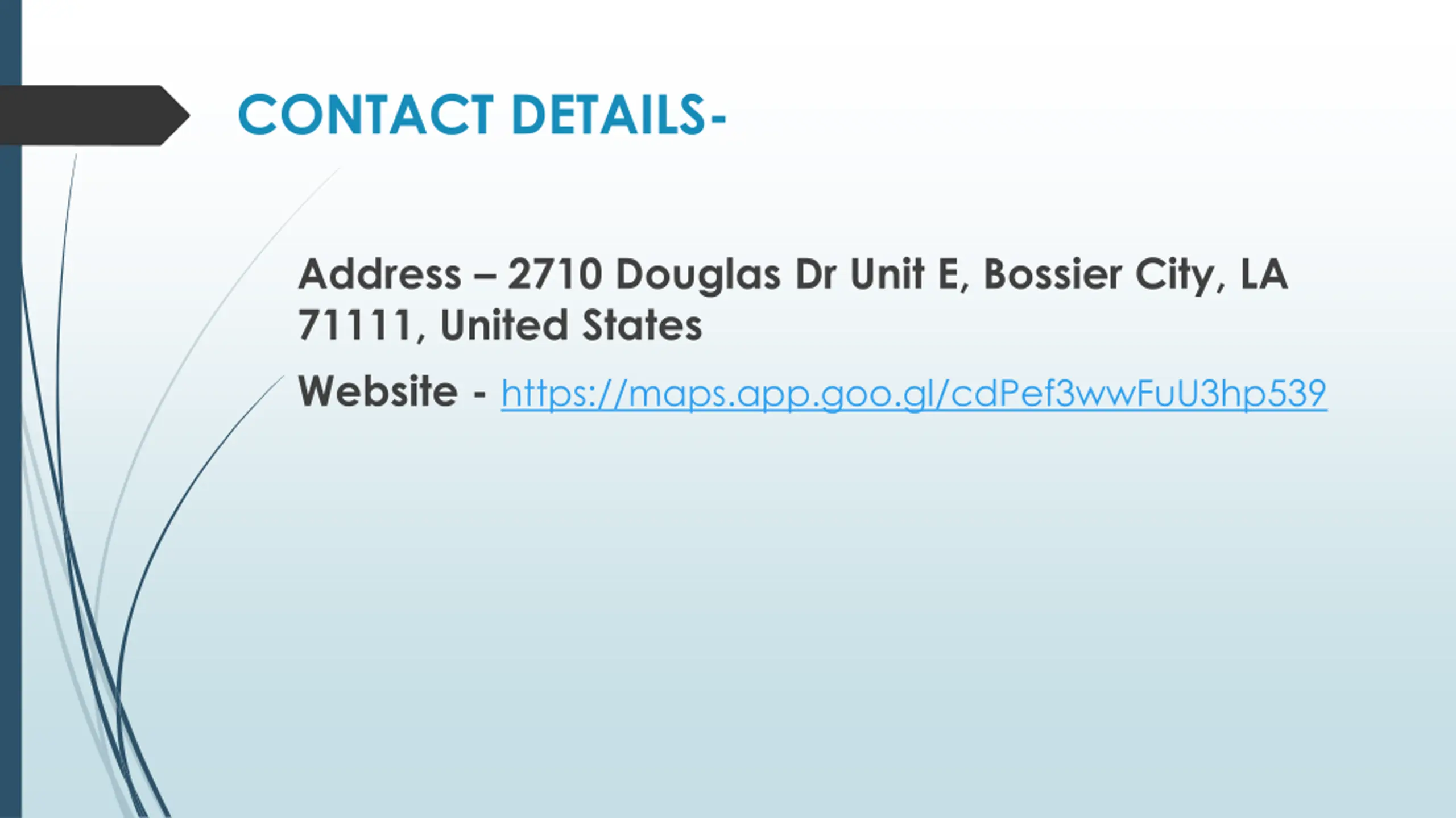 CONTACT DETAILS- Address 2710 Douglas Dr Unit E, Bossier City, LA 71111, United States Website - https://maps.app.goo.gl/cdPef3wwFuU3hp539
