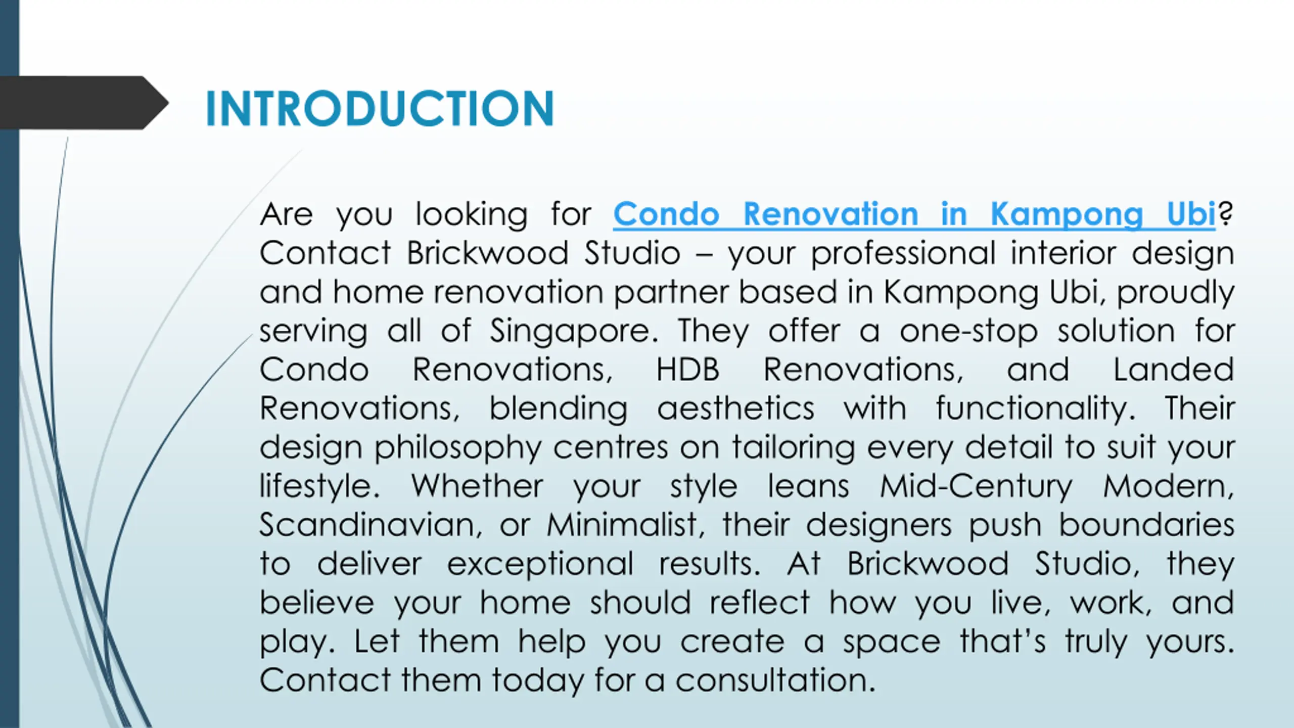 INTRODUCTION Are you looking for Condo Renovation in Kampong Ubi? Contact Brickwood Studio your professional interior design and home renovation partner based in Kampong Ubi, proudly serving all of Singapore. They offer a one-stop solution for Condo Renovations, HDB Renovations, and Landed Renovations, blending aesthetics with functionality. Their design philosophy centres on tailoring every detail to suit your lifestyle. Whether your style leans Mid-Century Modern, Scandinavian, or Minimalist, their designers push boundaries to deliver exceptional results. At Brickwood Studio, they believe your home should reflect how you live, work, and play. Let them help you create a space that s truly yours. Contact them today for a consultation. Are you looking for Condo Renovation in Kampong Ubi? Contact Brickwood Studio your professional interior design and home renovation partner based in Kampong Ubi, proudly serving all of Singapore. They offer a one-stop solution for Condo Renovations, HDB Renovations, blending aesthetics with functionality. Their design philosophy centres on tailoring every detail to suit your lifestyle. Whether your style leans Mid-Century Modern, Scandinavian, or Minimalist, their designers push boundaries to deliver exceptional results. At Brickwood Studio, they believe your home should reflect how you live, work, and play. Let them help you create a space that s truly yours. Contact them today for a consultation. Renovations, and Landed
