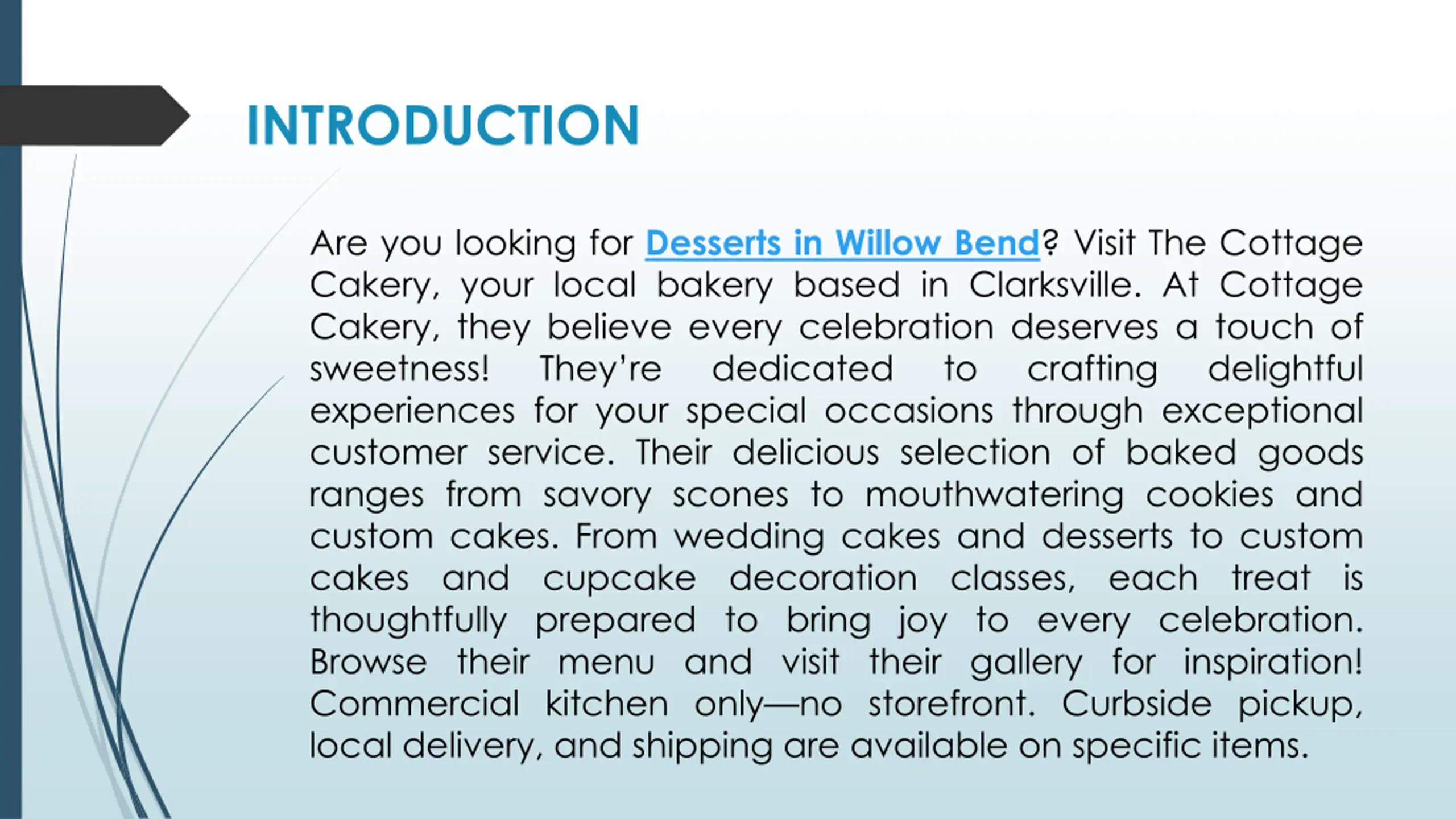 INTRODUCTION Are you looking for Desserts in Willow Bend? Visit The Cottage Cakery, your local bakery based in Clarksville. At Cottage Cakery, they believe every celebration deserves a touch of sweetness! They re dedicated to crafting delightful experiences for your special occasions through exceptional customer service. Their delicious selection of baked goods ranges from savory scones to mouthwatering cookies and custom cakes. From wedding cakes and desserts to custom cakes and cupcake decoration classes, each treat is thoughtfully prepared to bring joy to every celebration. Browse their menu and visit their gallery for inspiration! Commercial kitchen only no storefront. Curbside pickup, local delivery, and shipping are available on specific items. Are you looking for Desserts in Willow Bend? Visit The Cottage Cakery, your local bakery based in Clarksville. At Cottage Cakery, they believe every celebration deserves a touch of sweetness! They re dedicated experiences for your special occasions through exceptional customer service. Their delicious selection of baked goods ranges from savory scones to mouthwatering cookies and custom cakes. From wedding cakes and desserts to custom cakes and cupcake decoration classes, each treat is thoughtfully prepared to bring joy to every celebration. Browse their menu and visit their gallery for inspiration! Commercial kitchen only no storefront. Curbside pickup, local delivery, and shipping are available on specific items. to crafting delightful