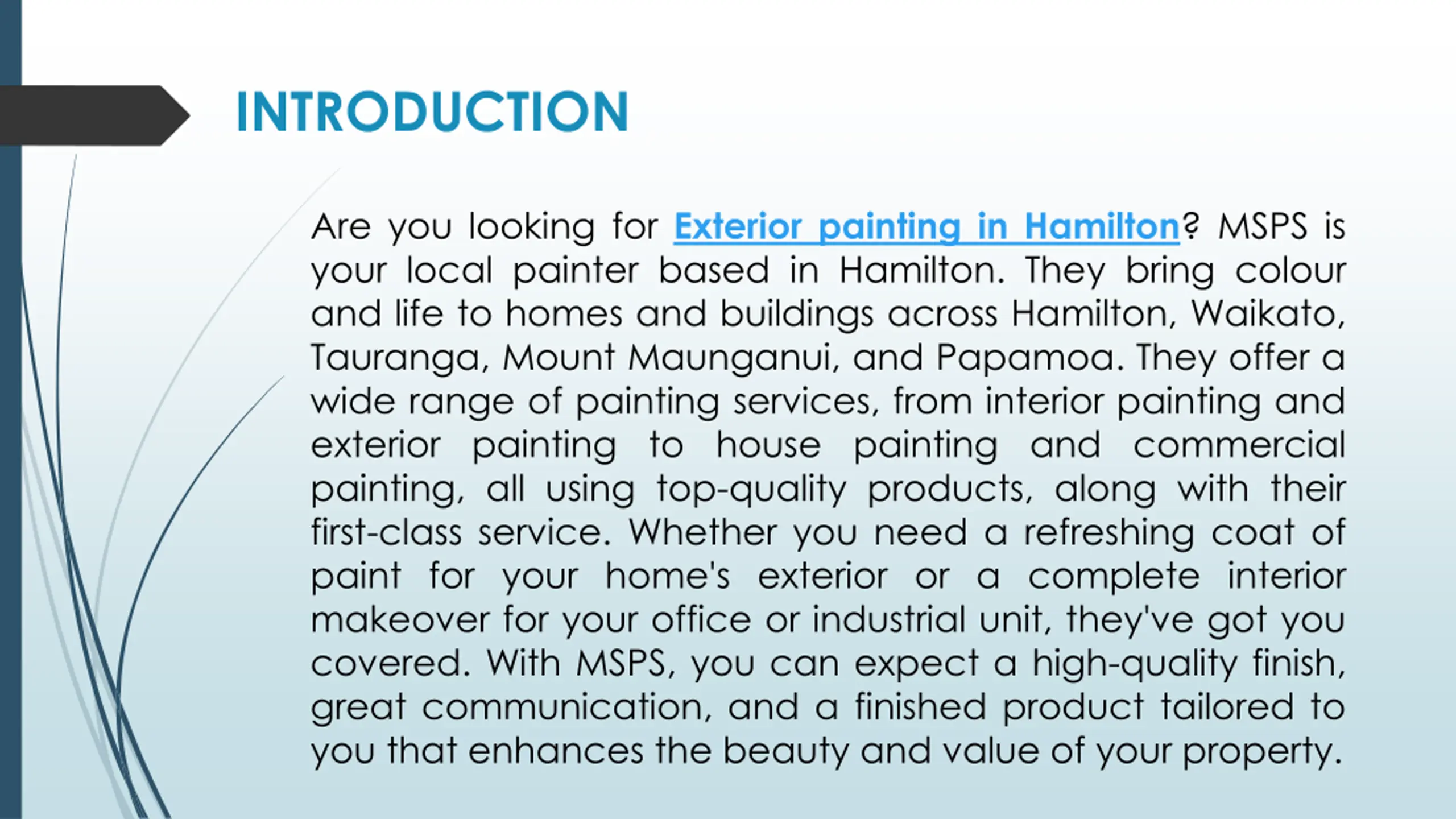 INTRODUCTION Are you looking for Exterior painting in Hamilton? MSPS is your local painter based in Hamilton. They bring colour and life to homes and buildings across Hamilton, Waikato, Tauranga, Mount Maunganui, and Papamoa. They offer a wide range of painting services, from interior painting and exterior painting to house painting and commercial painting, all using top-quality products, along with their first-class service. Whether you need a refreshing coat of paint for your home's exterior or a complete interior makeover for your office or industrial unit, they've got you covered. With MSPS, you can expect a high-quality finish, great communication, and a finished product tailored to you that enhances the beauty and value of your property.