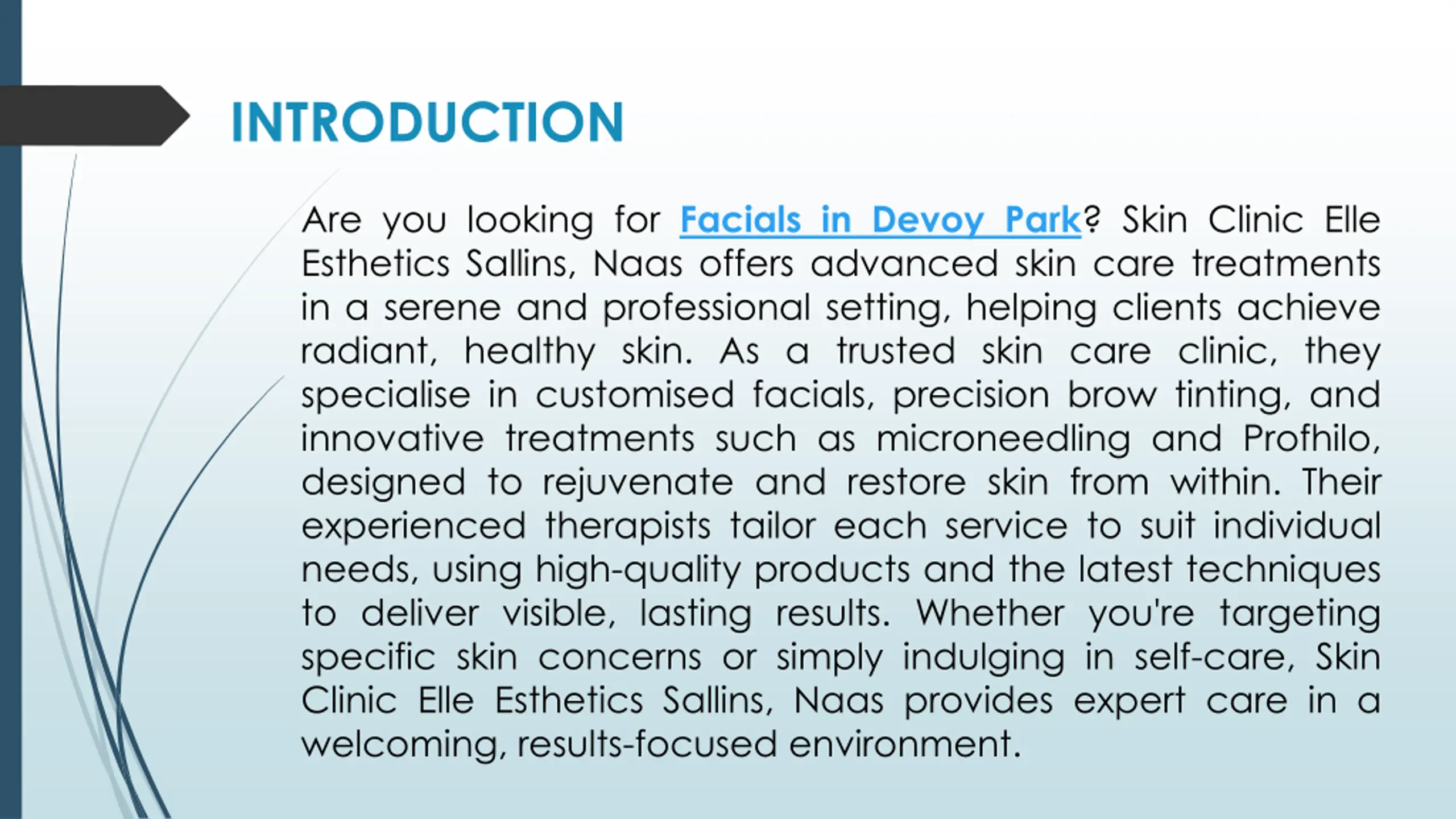 INTRODUCTION Are you looking for Facials in Devoy Park? Skin Clinic Elle Esthetics Sallins, Naas offers advanced skin care treatments in a serene and professional setting, helping clients achieve radiant, healthy skin. As a trusted skin care clinic, they specialise in customised facials, precision brow tinting, and innovative treatments such as microneedling and Profhilo, designed to rejuvenate and restore skin from within. Their experienced therapists tailor each service to suit individual needs, using high-quality products and the latest techniques to deliver visible, lasting results. Whether you're targeting specific skin concerns or simply indulging in self-care, Skin Clinic Elle Esthetics Sallins, Naas provides expert care in a welcoming, results-focused environment. Are you looking for Facials in Devoy Park? Skin Clinic Elle Esthetics Sallins, Naas offers advanced skin care treatments in a serene and professional setting, helping clients achieve radiant, healthy skin. As a trusted skin care clinic, they specialise in customised facials, precision brow tinting, and innovative treatments such as microneedling and Profhilo, designed to rejuvenate and restore skin from within. Their experienced therapists tailor each service to suit individual needs, using high-quality products and the latest techniques to deliver visible, lasting results. Whether you're targeting specific skin concerns or simply indulging in self-care, Skin Clinic Elle Esthetics Sallins, Naas provides expert care in a welcoming, results-focused environment.