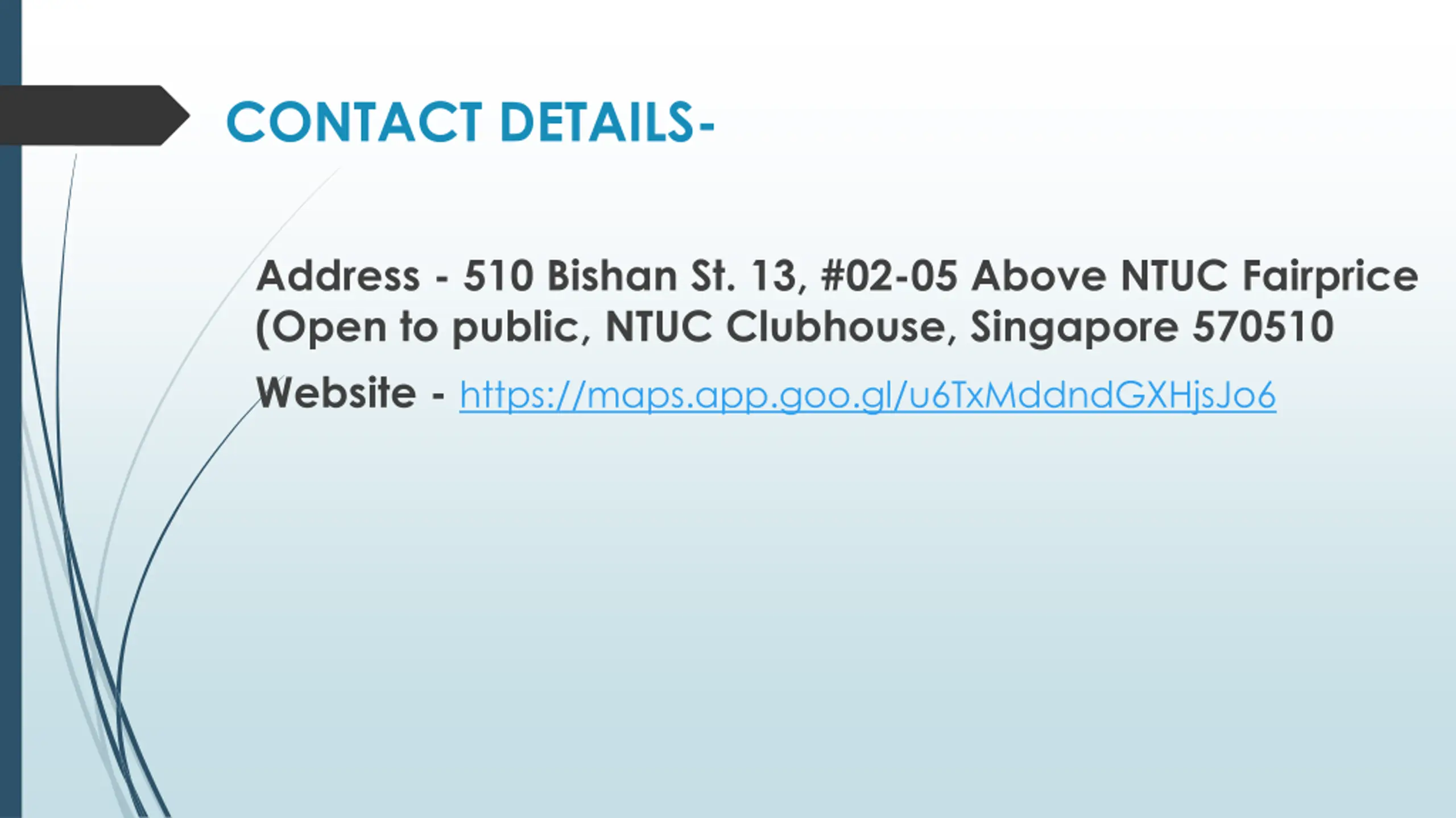 CONTACT DETAILS- Address - 510 Bishan St. 13, #02-05 Above NTUC Fairprice (Open to public, NTUC Clubhouse, Singapore 570510 Website - https://maps.app.goo.gl/u6TxMddndGXHjsJo6