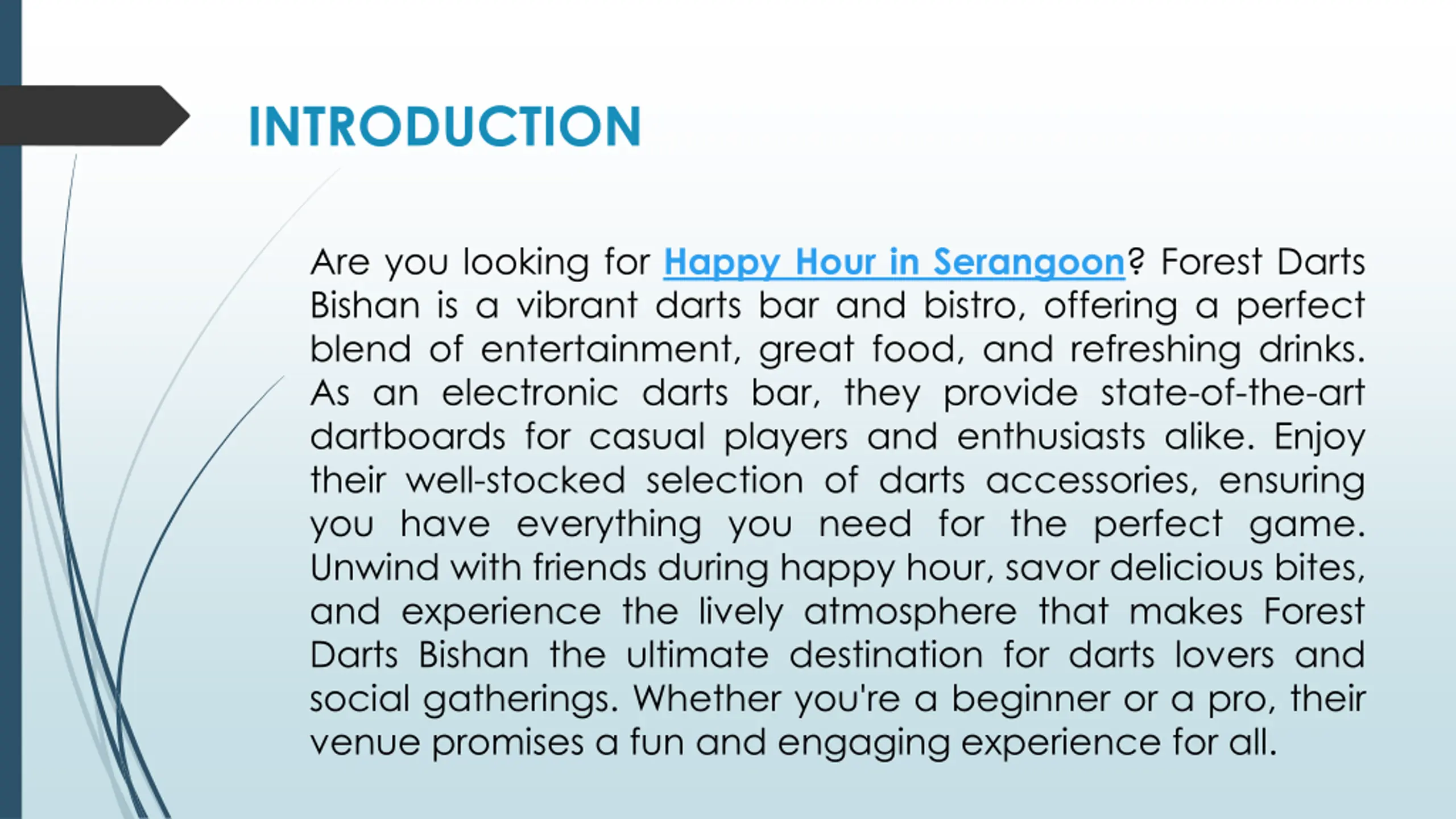 INTRODUCTION Are you looking for Happy Hour in Serangoon? Forest Darts Bishan is a vibrant darts bar and bistro, offering a perfect blend of entertainment, great food, and refreshing drinks. As an electronic darts bar, they provide state-of-the-art dartboards for casual players and enthusiasts alike. Enjoy their well-stocked selection of darts accessories, ensuring you have everything you need for the perfect game. Unwind with friends during happy hour, savor delicious bites, and experience the lively atmosphere that makes Forest Darts Bishan the ultimate destination for darts lovers and social gatherings. Whether you're a beginner or a pro, their venue promises a fun and engaging experience for all.