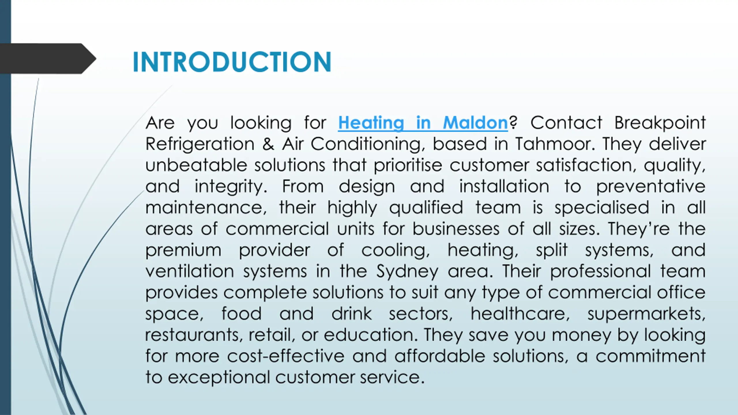 INTRODUCTION Are you looking for Heating in Maldon? Contact Breakpoint Refrigeration & Air Conditioning, based in Tahmoor. They deliver unbeatable solutions that prioritise customer satisfaction, quality, and integrity. From design and installation to preventative maintenance, their highly qualified team is specialised in all areas of commercial units for businesses of all sizes. They re the premium provider of cooling, heating, split systems, and ventilation systems in the Sydney area. Their professional team provides complete solutions to suit any type of commercial office space, food and drink sectors, healthcare, supermarkets, restaurants, retail, or education. They save you money by looking for more cost-effective and affordable solutions, a commitment to exceptional customer service.