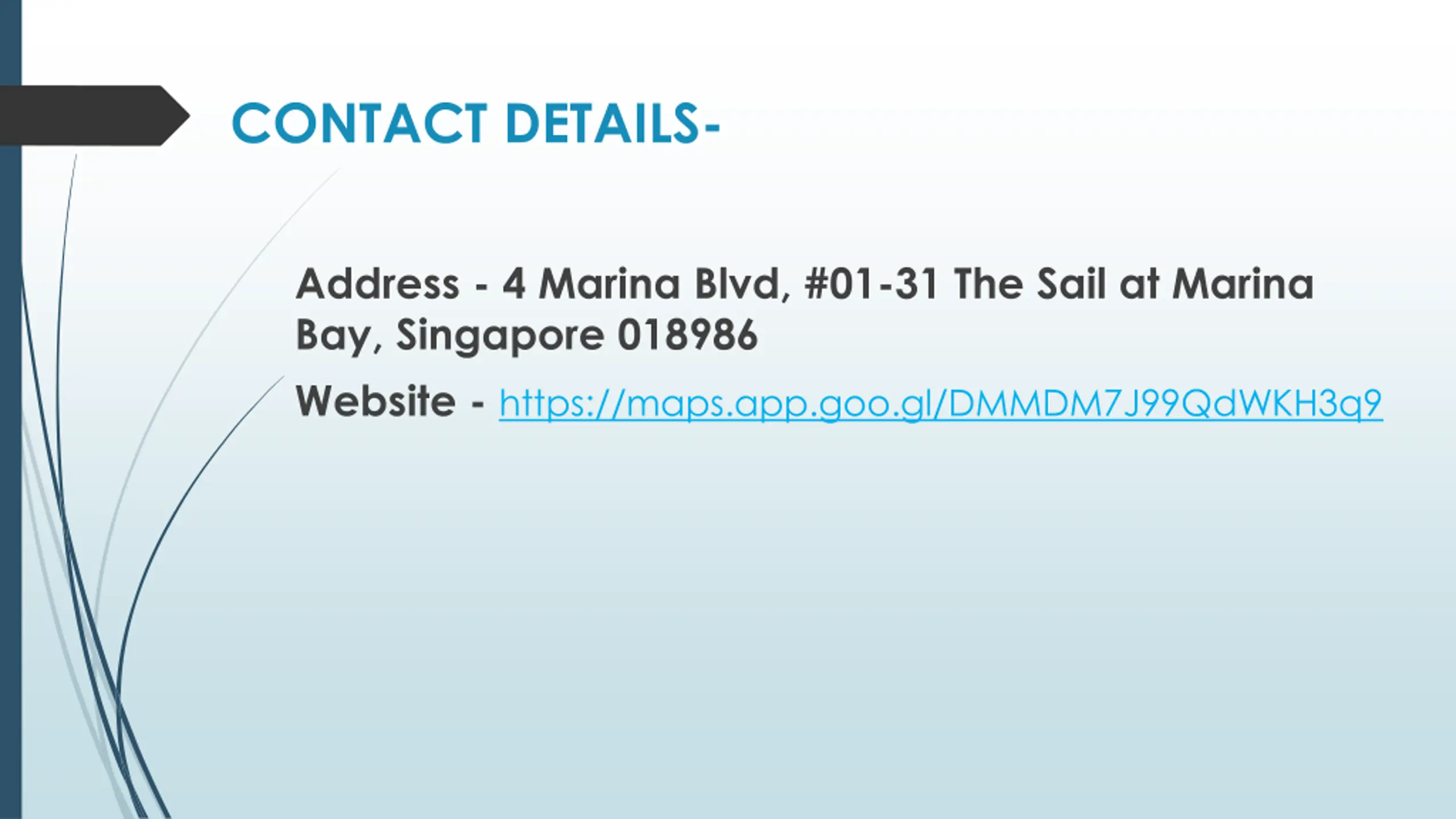 CONTACT DETAILS- Address - 4 Marina Blvd, #01-31 The Sail at Marina Bay, Singapore 018986 Website - https://maps.app.goo.gl/DMMDM7J99QdWKH3q9