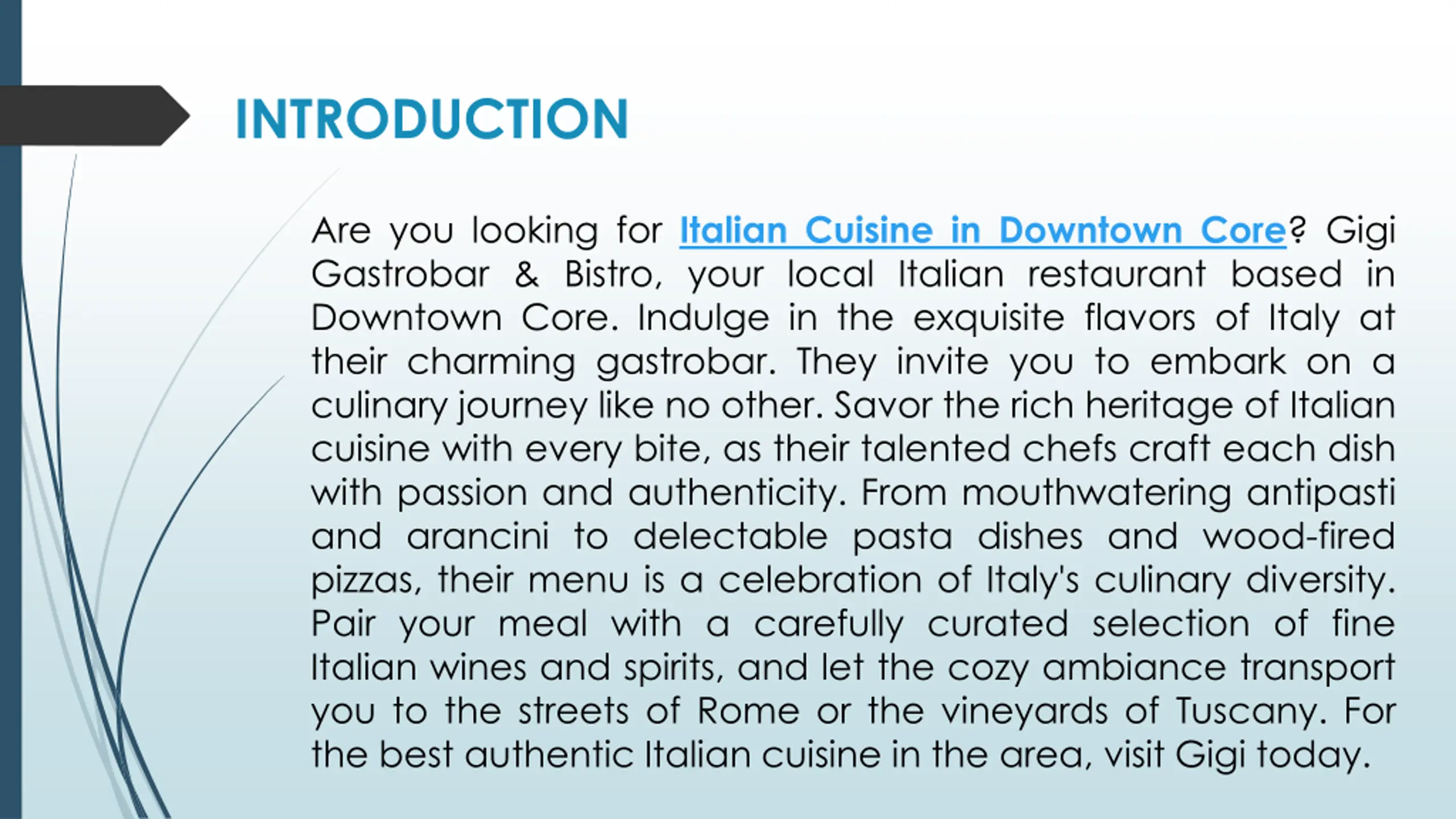 INTRODUCTION Are you looking for Italian Cuisine in Downtown Core? Gigi Gastrobar & Bistro, your local Italian restaurant based in Downtown Core. Indulge in the exquisite flavors of Italy at their charming gastrobar. They invite you to embark on a culinary journey like no other. Savor the rich heritage of Italian cuisine with every bite, as their talented chefs craft each dish with passion and authenticity. From mouthwatering antipasti and arancini to delectable pasta dishes and wood-fired pizzas, their menu is a celebration of Italy's culinary diversity. Pair your meal with a carefully curated selection of fine Italian wines and spirits, and let the cozy ambiance transport you to the streets of Rome or the vineyards of Tuscany. For the best authentic Italian cuisine in the area, visit Gigi today.