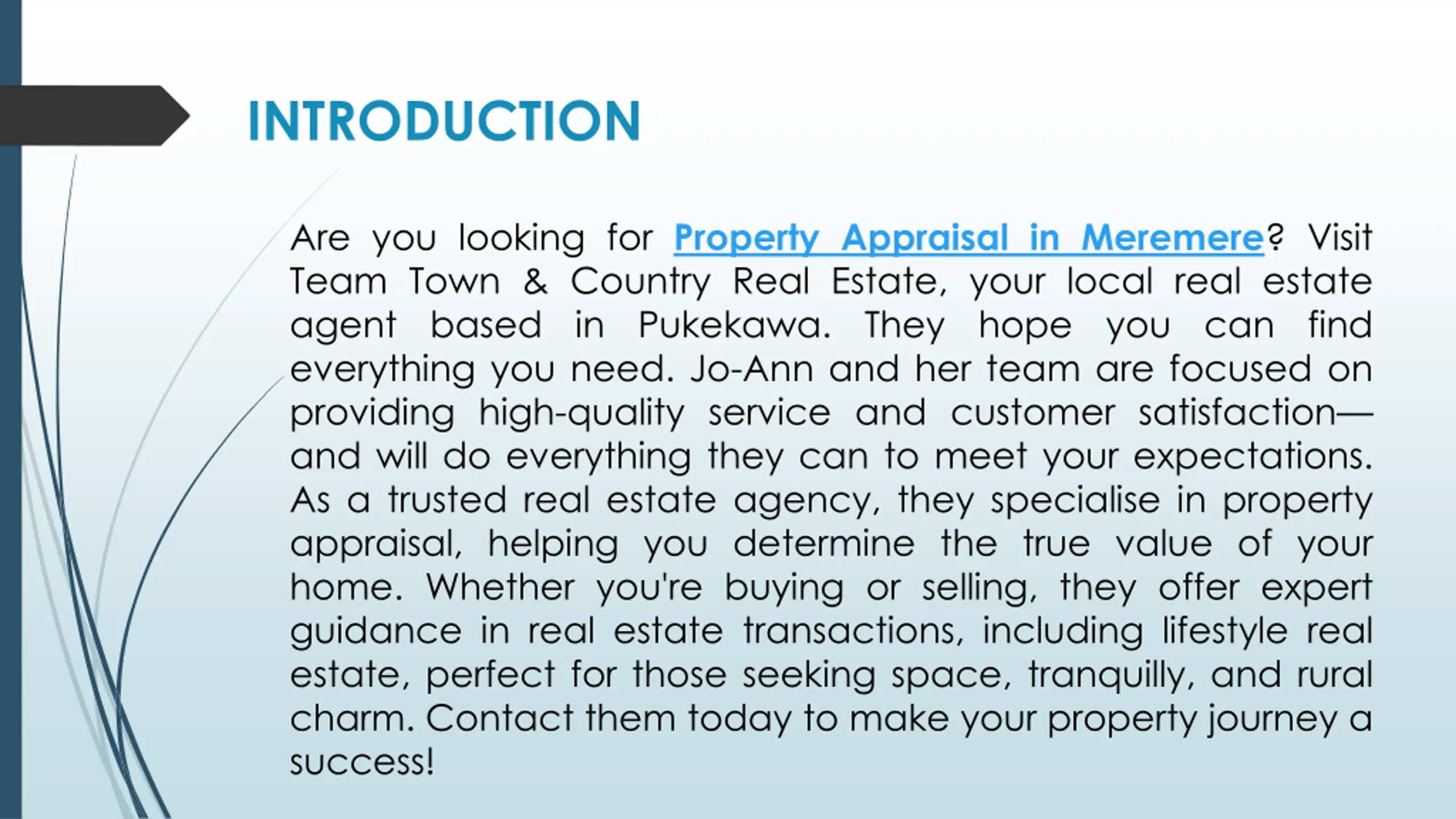 INTRODUCTION Are you looking for Property Appraisal in Meremere? Visit Team Town Country Real Estate, your local real estate agent based in Pukekawa. They hope you can find everything you need. Jo-Ann and her team are focused on providing high-quality service and customer satisfaction and will do everything they can to meet your expectations. As a trusted real estate agency, they specialise in property appraisal, helping you determine the true value of your home. Whether you're buying or selling, they offer expert guidance in real estate transactions, including lifestyle real estate, perfect for those seeking space, tranquilly, and rural charm. Contact them today to make your property journey a success! Are you looking for Property Appraisal in Meremere? Visit Team Town & Country Real Estate, your local real estate agent based in Pukekawa. They hope you can find everything you need. Jo-Ann and her team are focused on providing high-quality service and customer satisfaction and will do everything they can to meet your expectations. As a trusted real estate agency, they specialise in property appraisal, helping you determine the true value of your home. Whether you're buying or selling, they offer expert guidance in real estate transactions, including lifestyle real estate, perfect for those seeking space, tranquilly, and rural charm. Contact them today to make your property journey a success!