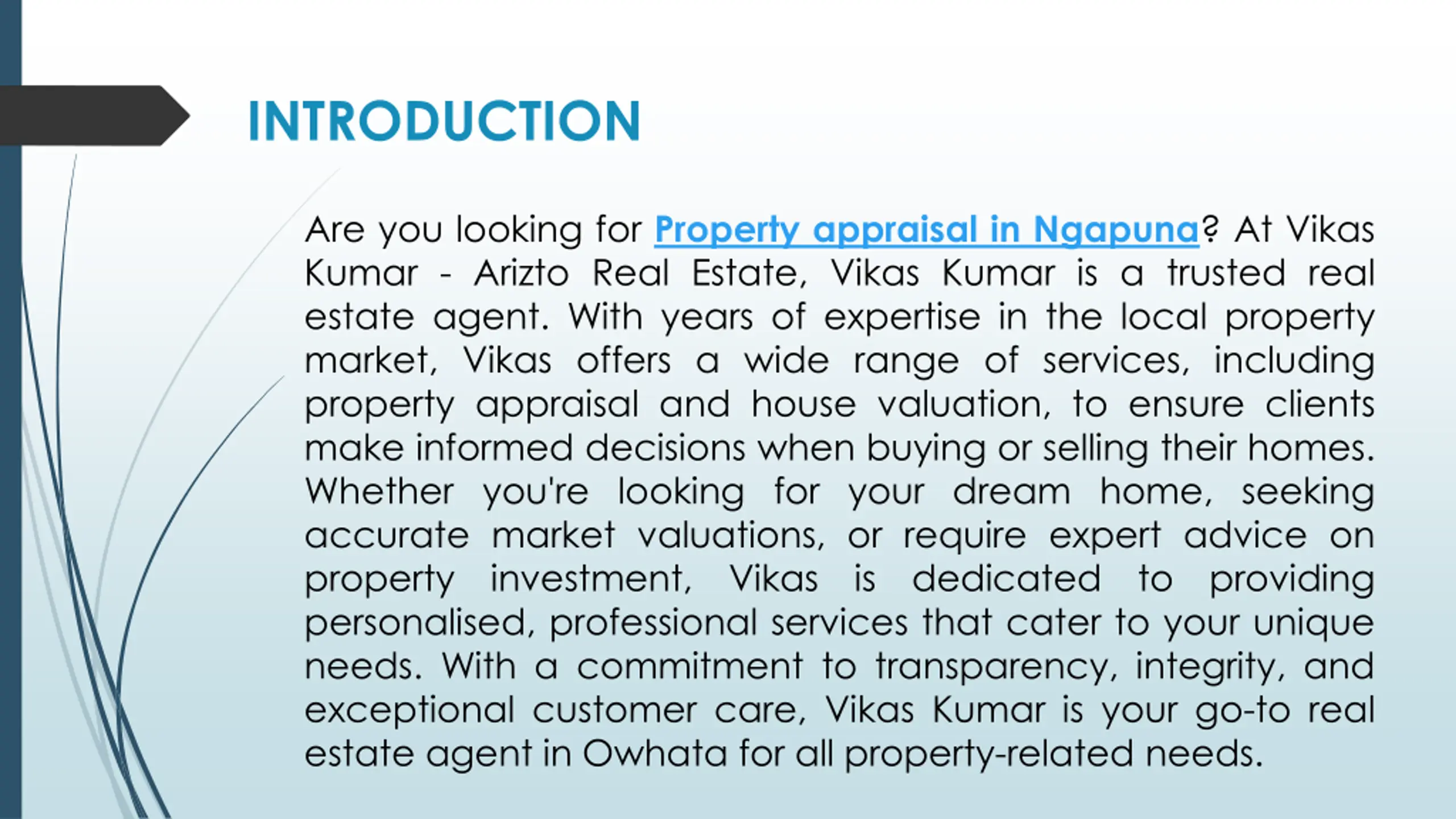 INTRODUCTION Are you looking for Property appraisal in Ngapuna? At Vikas Kumar - Arizto Real Estate, Vikas Kumar is a trusted real estate agent. With years of expertise in the local property market, Vikas offers a wide range of services, including property appraisal and house valuation, to ensure clients make informed decisions when buying or selling their homes. Whether you're looking for your dream home, seeking accurate market valuations, or require expert advice on property investment, Vikas is dedicated to providing personalised, professional services that cater to your unique needs. With a commitment to transparency, integrity, and exceptional customer care, Vikas Kumar is your go-to real estate agent in Owhata for all property-related needs. Are you looking for Property appraisal in Ngapuna? At Vikas Kumar - Arizto Real Estate, Vikas Kumar is a trusted real estate agent. With years of expertise in the local property market, Vikas offers a wide range of services, including property appraisal and house valuation, to ensure clients make informed decisions when buying or selling their homes. Whether you're looking for your dream home, seeking accurate market valuations, or require expert advice on property investment, Vikas is dedicated to providing personalised, professional services that cater to your unique needs. With a commitment to transparency, integrity, and exceptional customer care, Vikas Kumar is your go-to real estate agent in Owhata for all property-related needs.