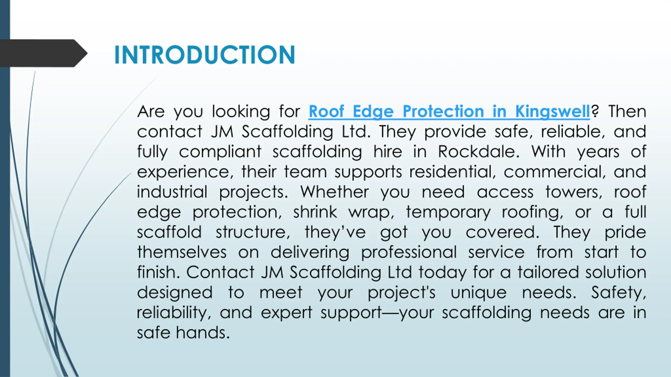 INTRODUCTION Are you looking for Roof Edge Protection in Kingswell? Then contact JM Scaffolding Ltd. They provide safe, reliable, and fully compliant scaffolding hire in Rockdale. With years of experience, their team supports residential, commercial, and industrial projects. Whether you need access towers, roof edge protection, shrink wrap, temporary roofing, or a full scaffold structure, they ve got you covered. They pride themselves on delivering professional service from start to finish. Contact JM Scaffolding Ltd today for a tailored solution designed to meet your project's unique needs. Safety, reliability, and expert support your scaffolding needs are in safe hands.