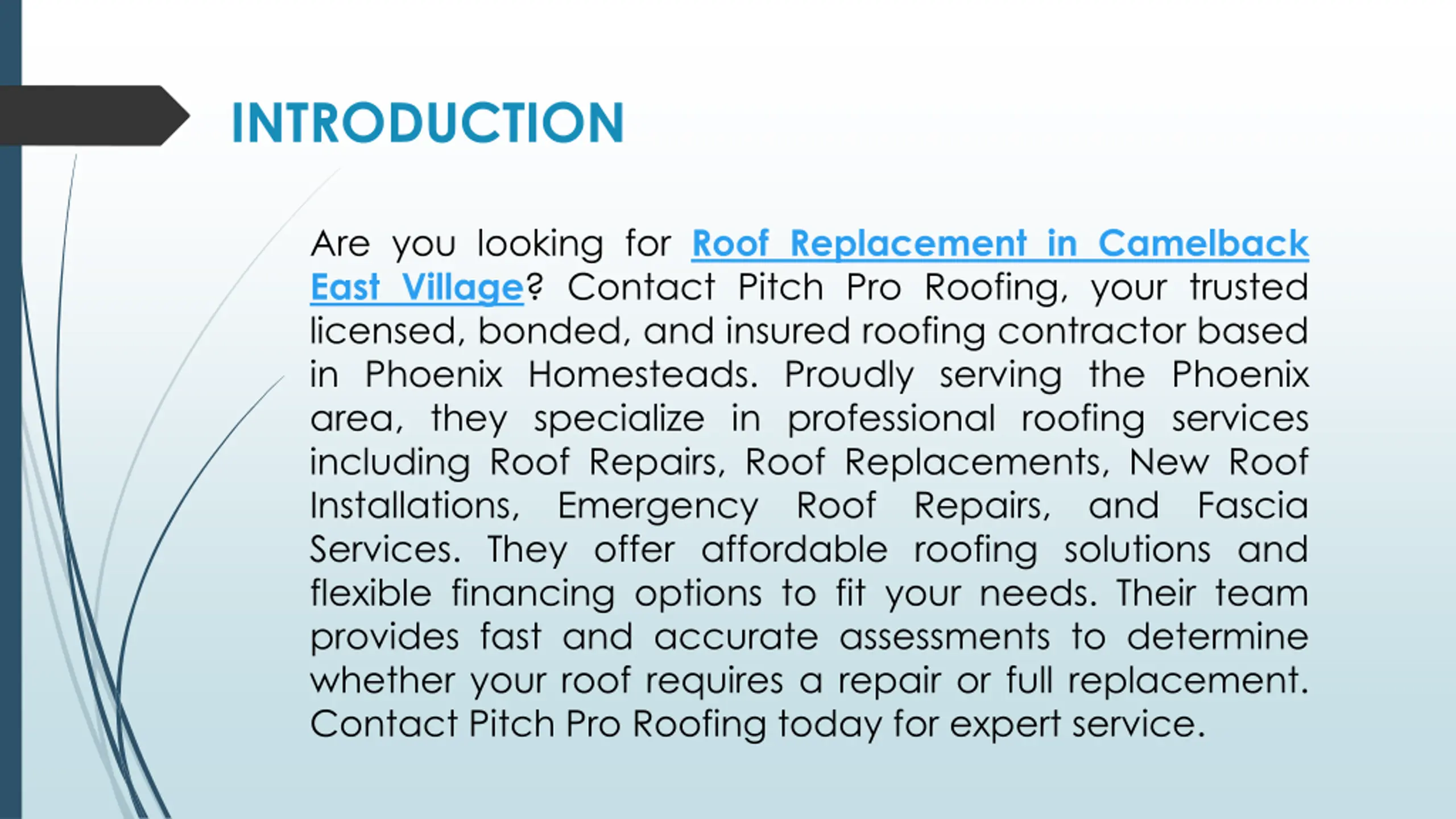INTRODUCTION Are you looking for Roof Replacement in Camelback East Village? Contact Pitch Pro Roofing, your trusted licensed, bonded, and insured roofing contractor based in Phoenix Homesteads. Proudly serving the Phoenix area, they specialize in professional roofing services including Roof Repairs, Roof Replacements, New Roof Installations, Emergency Roof Repairs, and Fascia Services. They offer affordable roofing solutions and flexible financing options to fit your needs. Their team provides fast and accurate assessments to determine whether your roof requires a repair or full replacement. Contact Pitch Pro Roofing today for expert service.