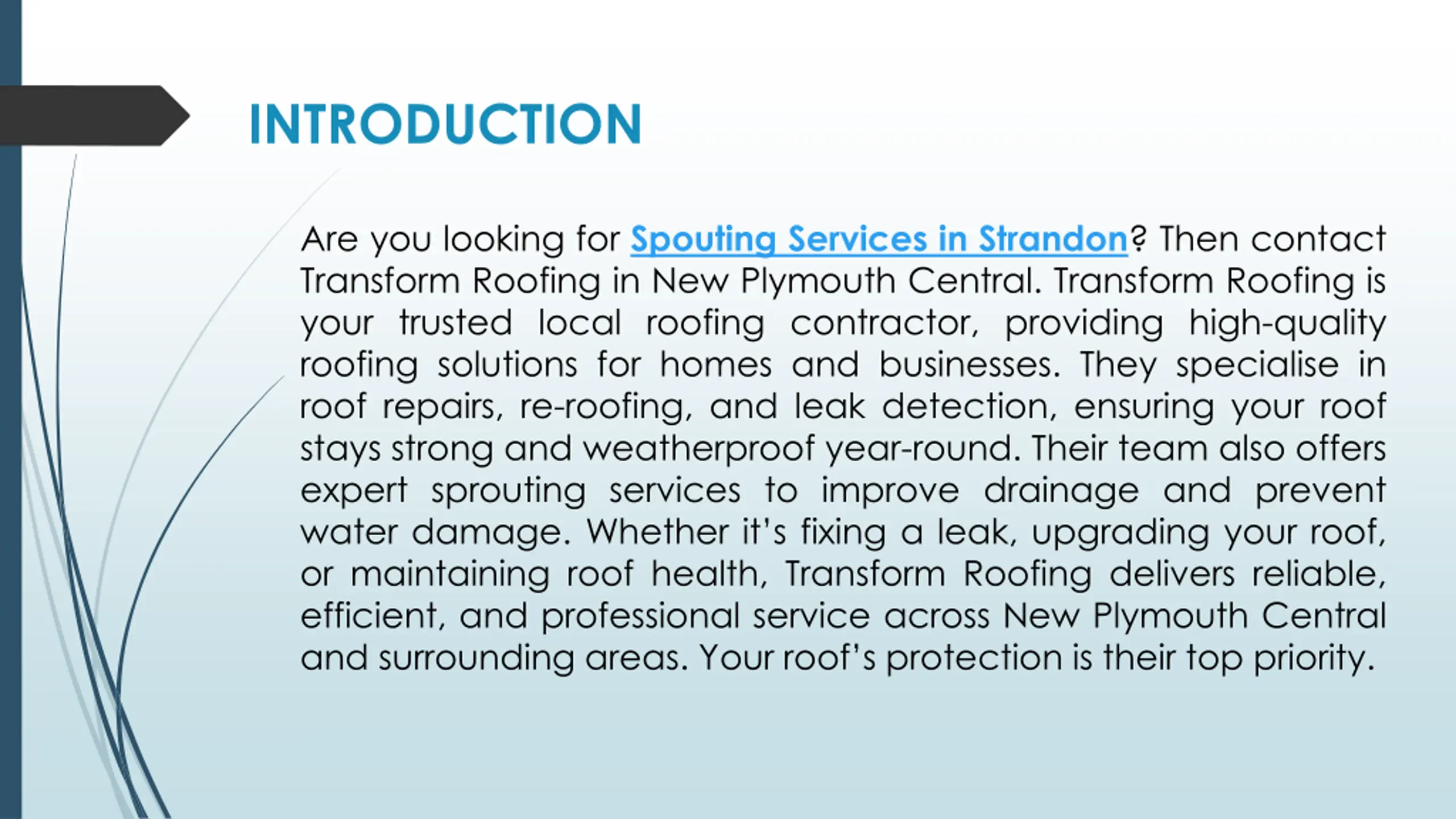 INTRODUCTION Are you looking for Spouting Services in Strandon? Then contact Transform Roofing in New Plymouth Central. Transform Roofing is your trusted local roofing contractor, providing high-quality roofing solutions for homes and businesses. They specialise in roof repairs, re-roofing, and leak detection, ensuring your roof stays strong and weatherproof year-round. Their team also offers expert sprouting services to improve drainage and prevent water damage. Whether it s fixing a leak, upgrading your roof, or maintaining roof health, Transform Roofing delivers reliable, efficient, and professional service across New Plymouth Central and surrounding areas. Your roof s protection is their top priority.