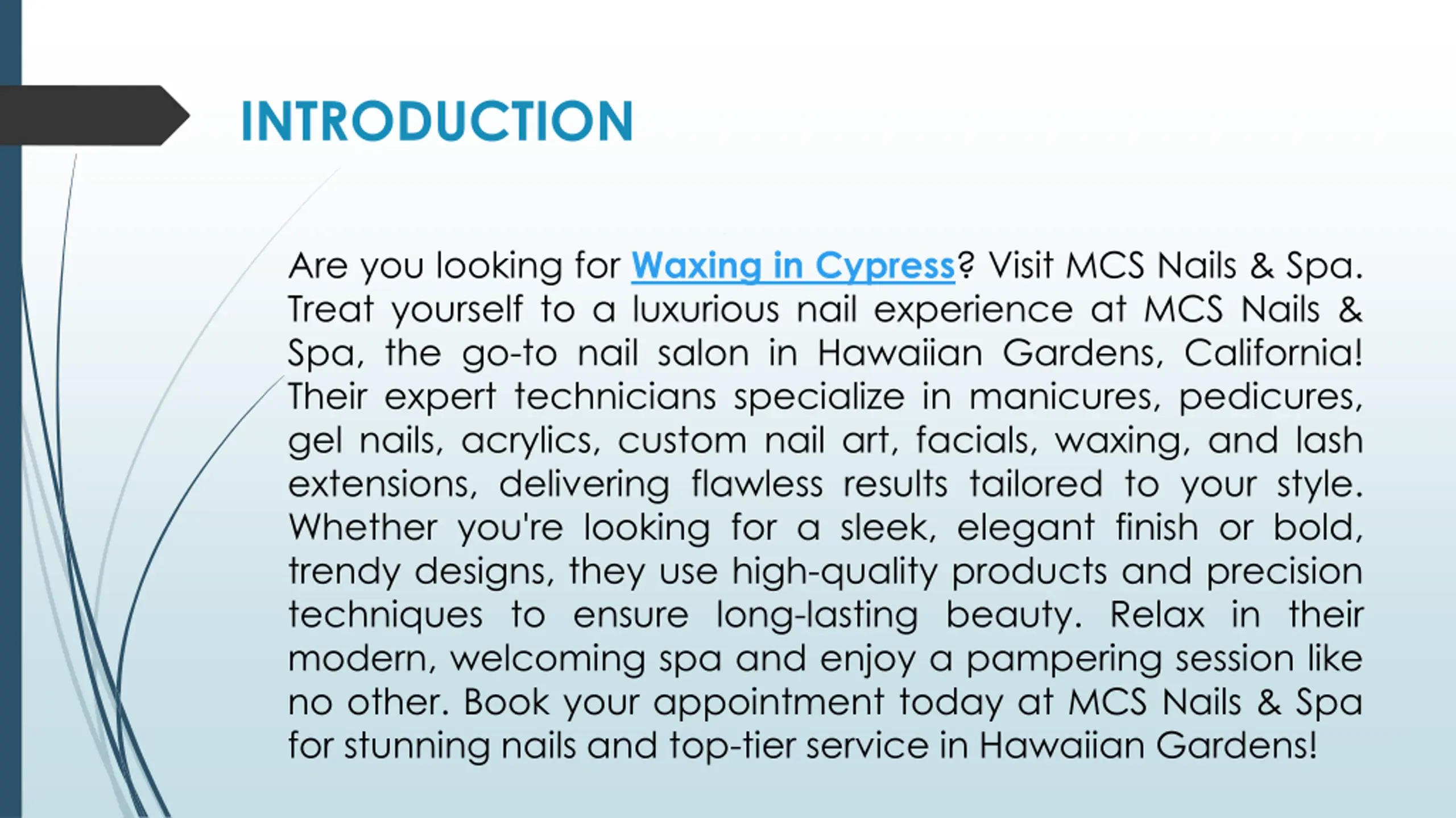 INTRODUCTION Are you looking for Waxing in Cypress? Visit MCS Nails Spa. Treat yourself to a luxurious nail experience at MCS Nails Spa, the go-to nail salon in Hawaiian Gardens, California! Their expert technicians specialize in manicures, pedicures, gel nails, acrylics, custom nail art, facials, waxing, and lash extensions, delivering flawless results tailored to your style. Whether you're looking for a sleek, elegant finish or bold, trendy designs, they use high-quality products and precision techniques to ensure long-lasting beauty. Relax in their modern, welcoming spa and enjoy a pampering session like no other. Book your appointment today at MCS Nails Spa for stunning nails and top-tier service in Hawaiian Gardens! Are you looking for Waxing in Cypress? Visit MCS Nails & Spa. Treat yourself to a luxurious nail experience at MCS Nails & Spa, the go-to nail salon in Hawaiian Gardens, California! Their expert technicians specialize in manicures, pedicures, gel nails, acrylics, custom nail art, facials, waxing, and lash extensions, delivering flawless results tailored to your style. Whether you're looking for a sleek, elegant finish or bold, trendy designs, they use high-quality products and precision techniques to ensure long-lasting beauty. Relax in their modern, welcoming spa and enjoy a pampering session like no other. Book your appointment today at MCS Nails & Spa for stunning nails and top-tier service in Hawaiian Gardens!