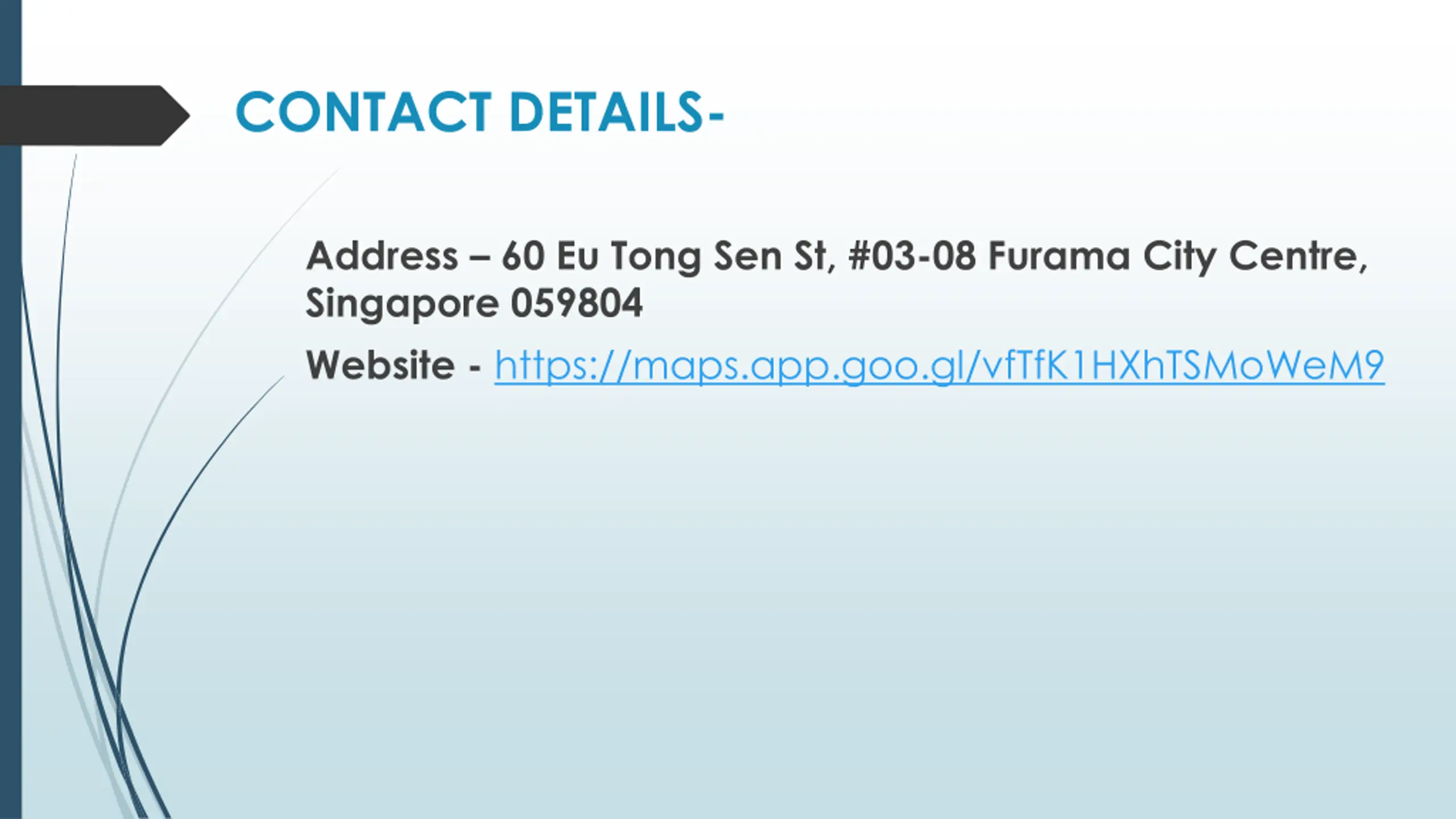 CONTACT DETAILS- Address 60 Eu Tong Sen St, #03-08 Furama City Centre, Singapore 059804 Website - https://maps.app.goo.gl/vfTfK1HXhTSMoWeM9