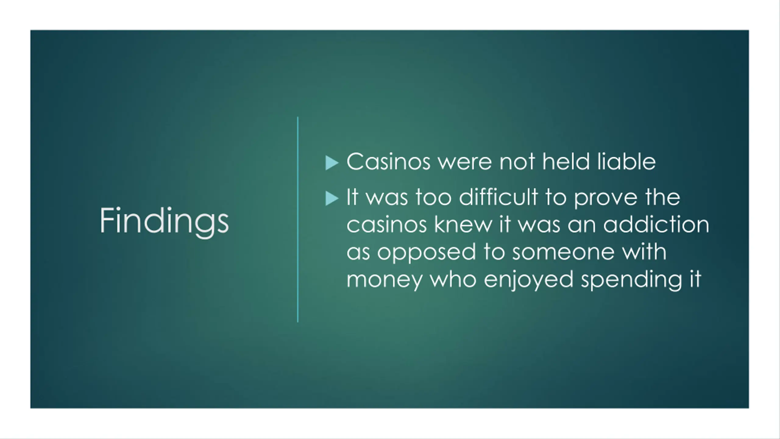 Casinos were not held liable It was too difficult to prove the casinos knew it was an addiction as opposed to someone with money who enjoyed spending it Findings
