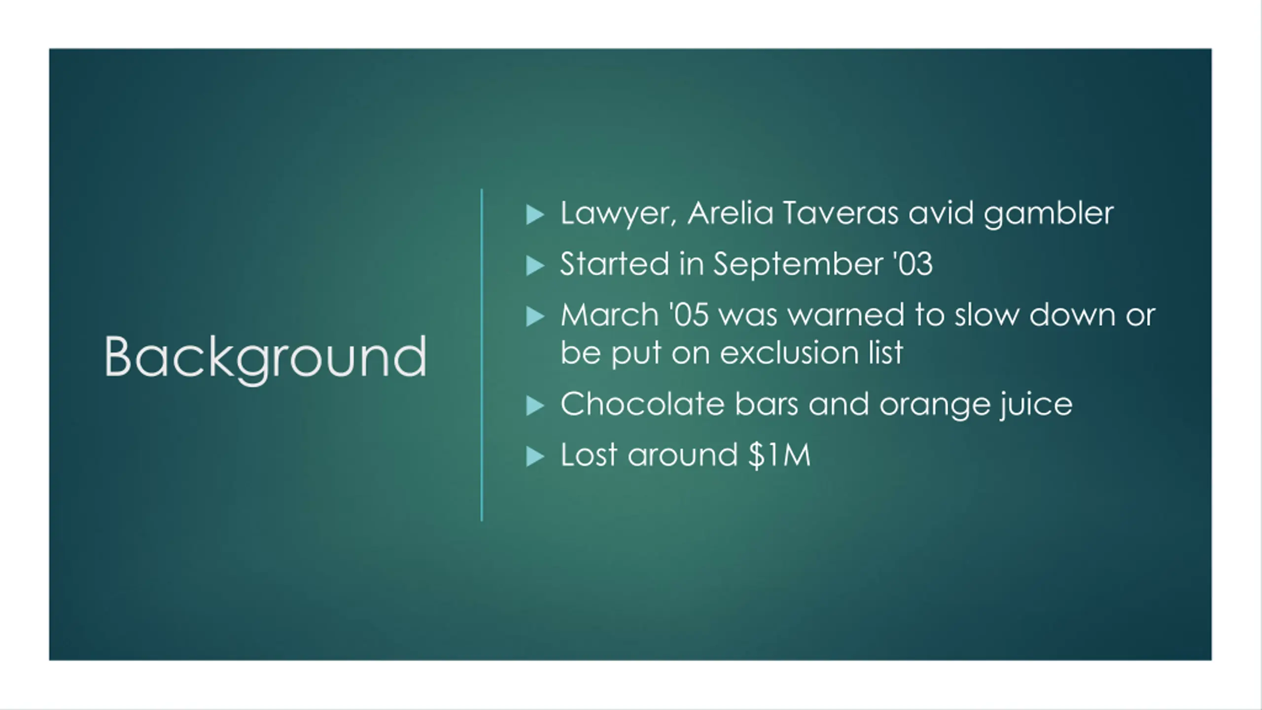 Lawyer, Arelia Taveras avid gambler Started in September '03 March '05 was warned to slow down or be put on exclusion list Chocolate bars and orange juice Lost around $1M Background