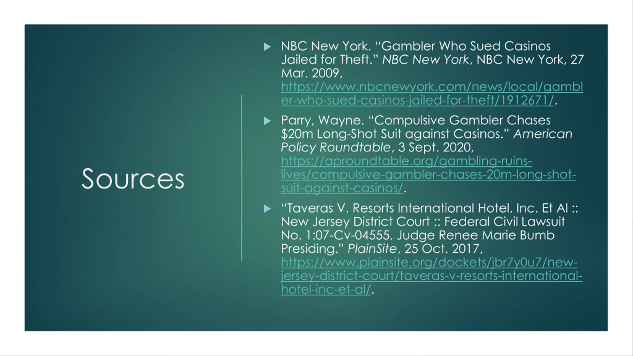 NBC New York. Gambler Who Sued Casinos Jailed for Theft. NBC New York, NBC New York, 27 Mar. 2009, https://www.nbcnewyork.com/news/local/gambl er-who-sued-casinos-jailed-for-theft/1912671/. Parry, Wayne. Compulsive Gambler Chases $20m Long-Shot Suit against Casinos. American Policy Roundtable, 3 Sept. 2020, https://aproundtable.org/gambling-ruins- lives/compulsive-gambler-chases-20m-long-shot- suit-against-casinos/. Taveras V. Resorts International Hotel, Inc. Et Al :: New Jersey District Court :: Federal Civil Lawsuit No. 1:07-Cv-04555, Judge Renee Marie Bumb Presiding. PlainSite, 25 Oct. 2017, https://www.plainsite.org/dockets/jbr7y0u7/new- jersey-district-court/taveras-v-resorts-international- hotel-inc-et-al/. Sources