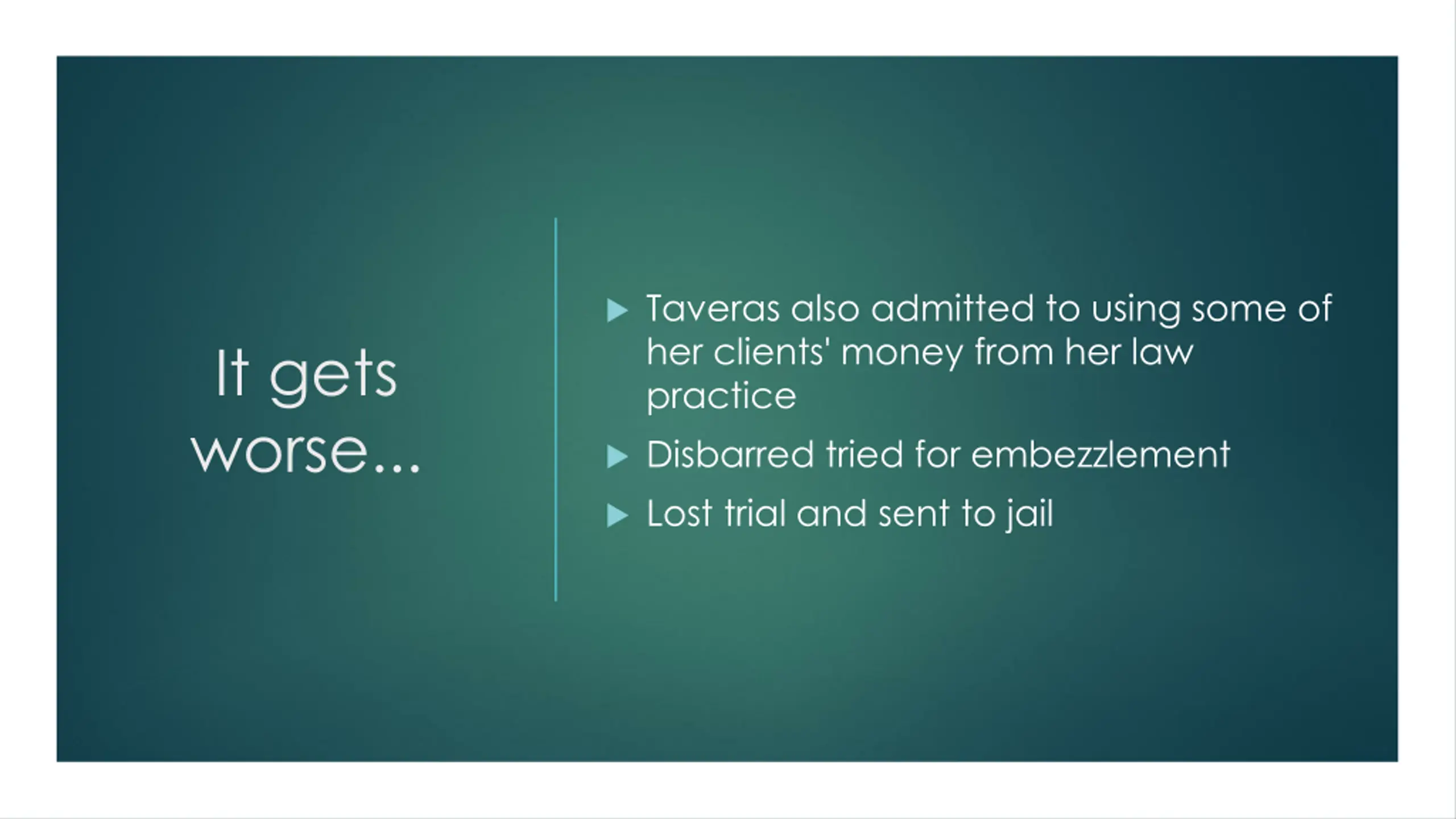 Taveras also admitted to using some of her clients' money from her law practice Disbarred tried for embezzlement Lost trial and sent to jail It gets worse...