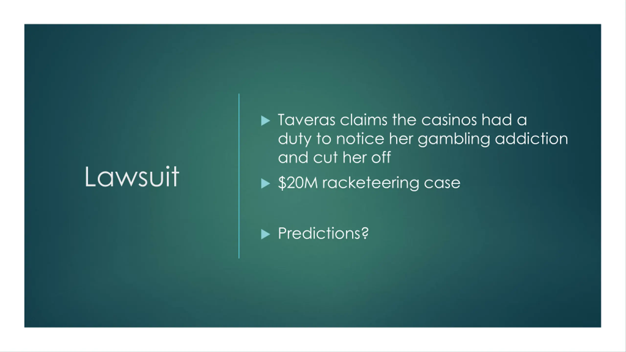 Taveras claims the casinos had a duty to notice her gambling addiction and cut her off $20M racketeering case Lawsuit Predictions?