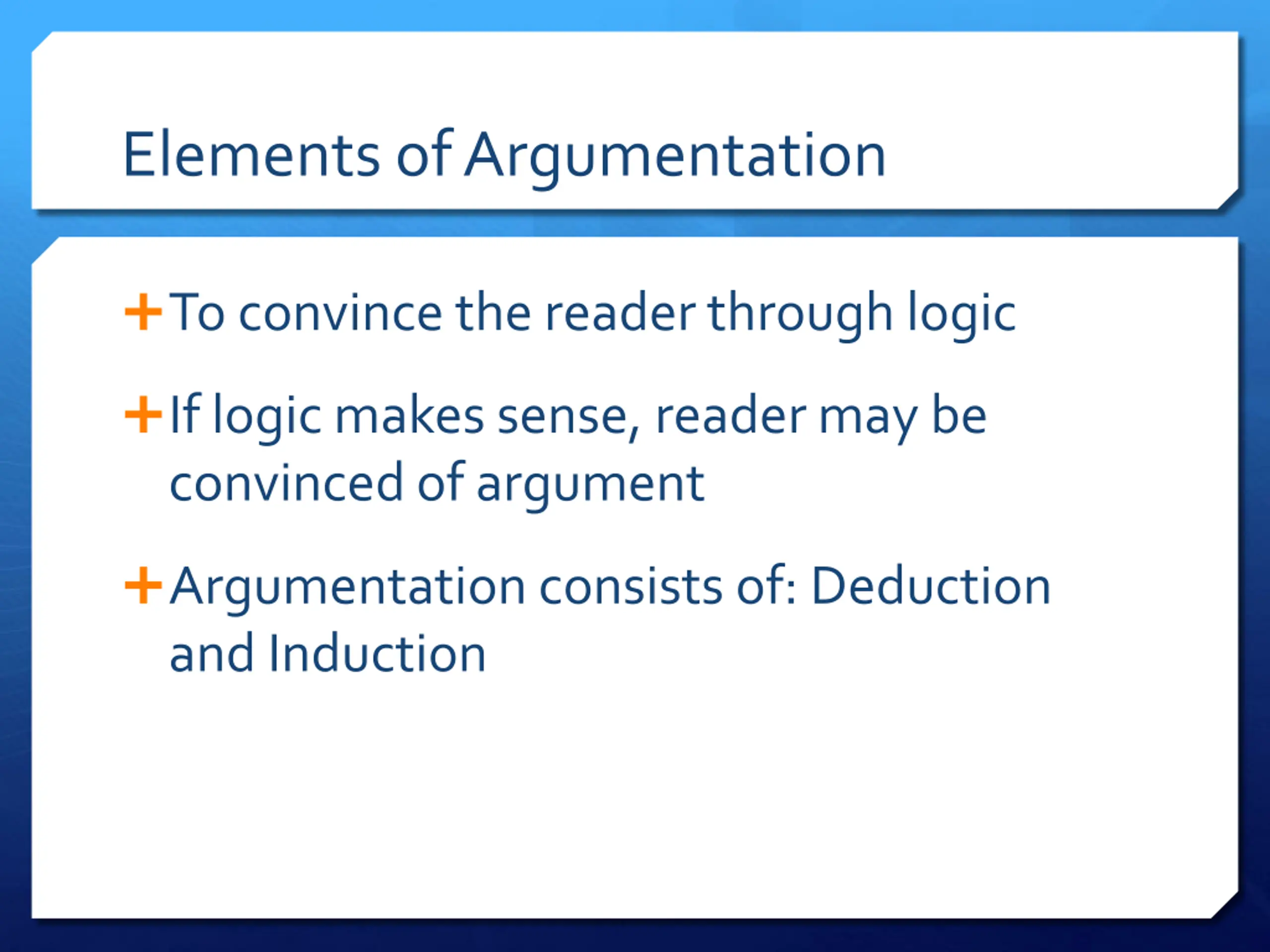 Elements of Argumentation To convince the reader through logic If logic makes sense, reader may be convinced of argument Argumentation consists of: Deduction and Induction