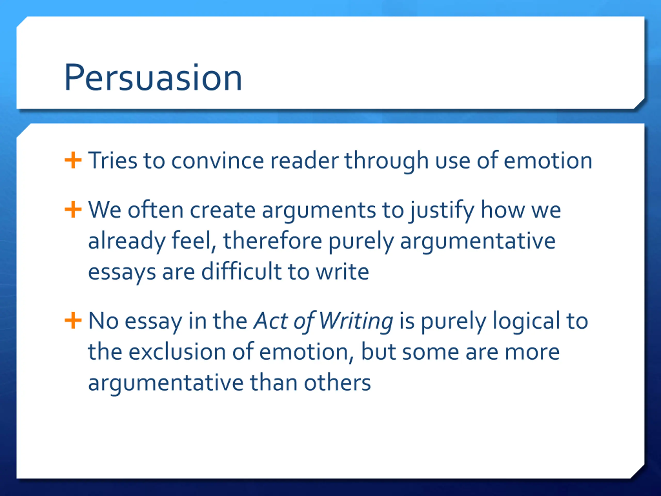 Persuasion Tries to convince reader through use of emotion We often create arguments to justify how we already feel, therefore purely argumentative essays are difficult to write No essay in the Act of Writing is purely logical to the exclusion of emotion, but some are more argumentative than others