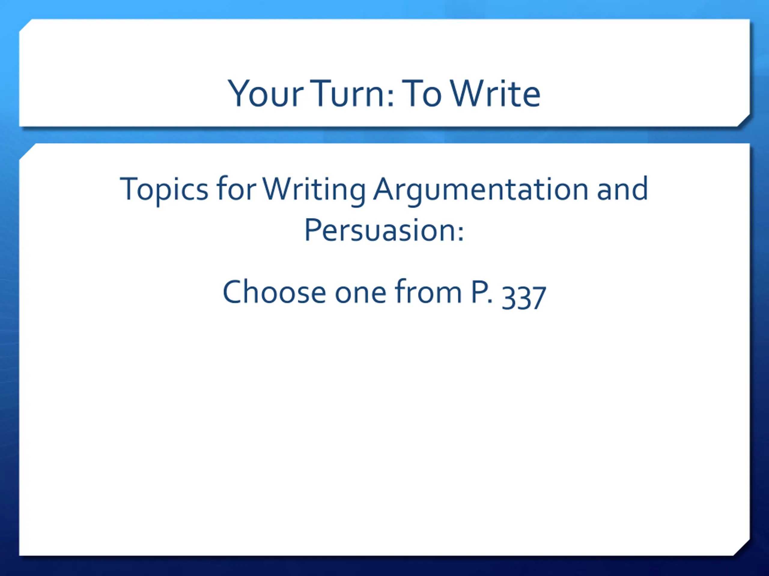 Your Turn: To Write Topics for Writing Argumentation and Persuasion: Choose one from P. 337