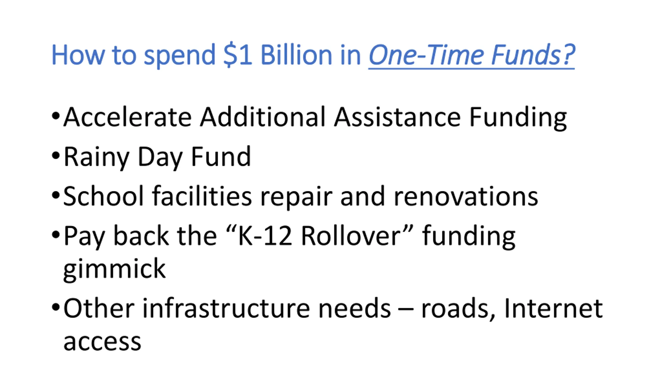 How to spend $1 Billion in How to spend $1 Billion in One One- -Time Funds? Time Funds? Accelerate Additional Assistance Funding Rainy Day Fund School facilities repair and renovations Pay back the K-12 Rollover funding gimmick Other infrastructure needs roads, Internet access