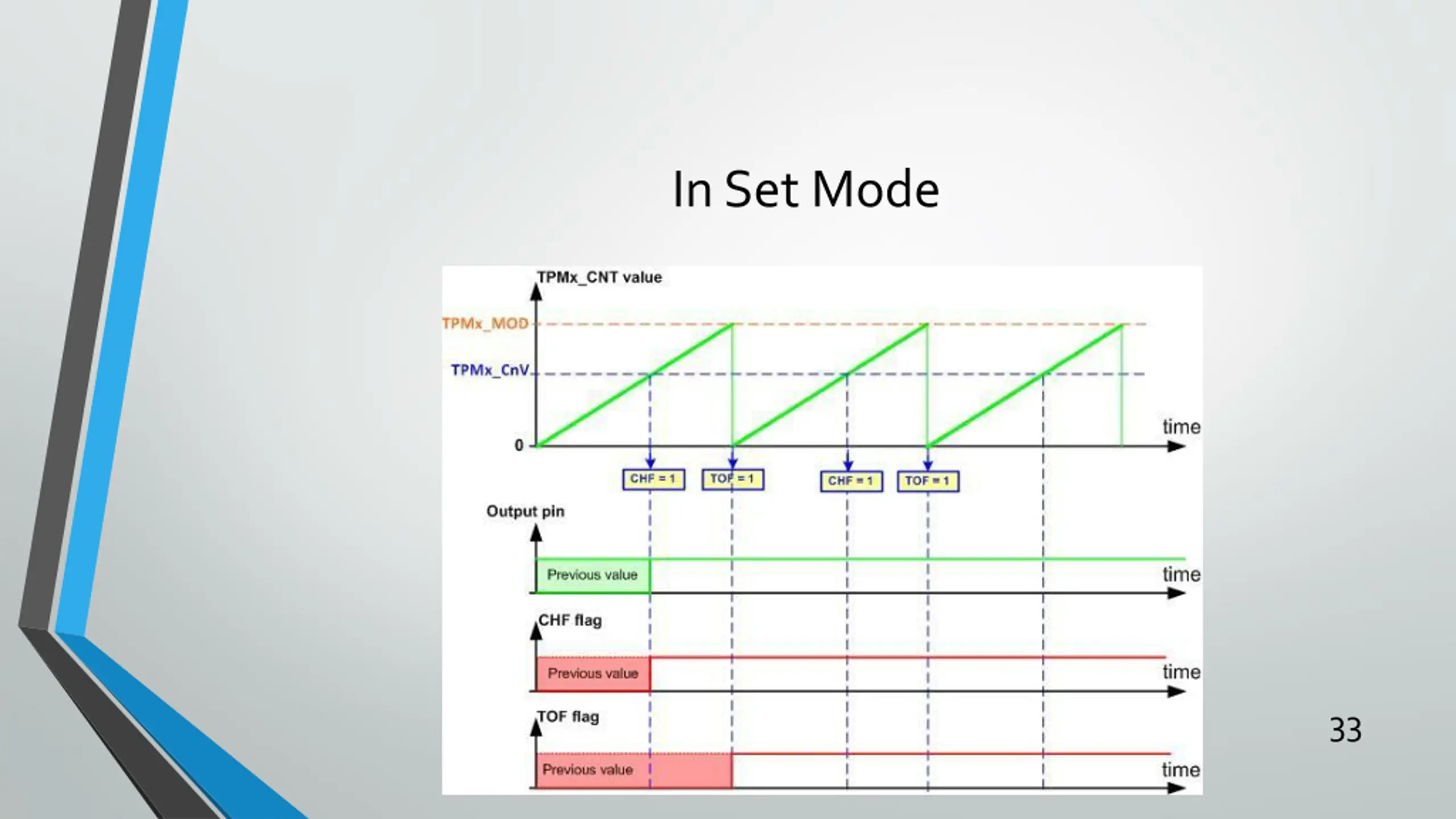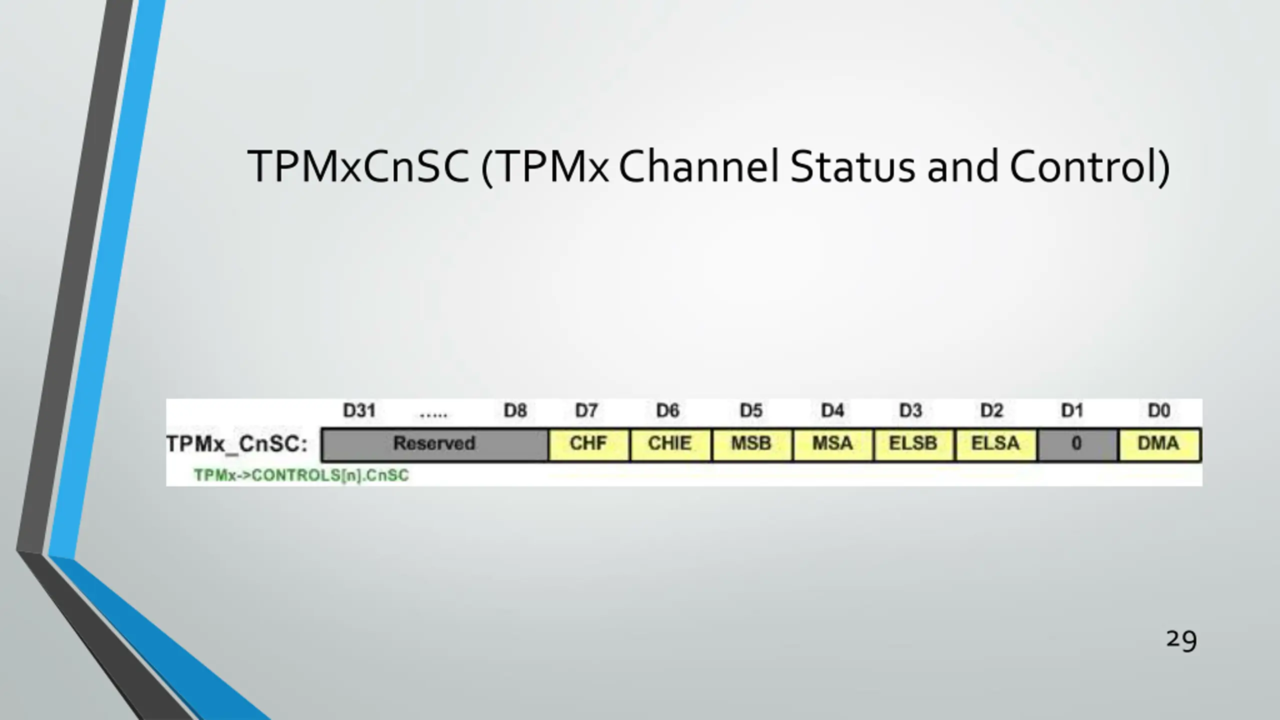 TPMxCnSC Register Field Bit Description CHF 7 Channel Flag CHIE 6 Channel interrupt enable MSB and MSA 5-4 Channel mode select ELSB and ELSA 3-2 Edge or Level Select DMA 0 DMA enable (0: Disabled, 1: Enabled) 30