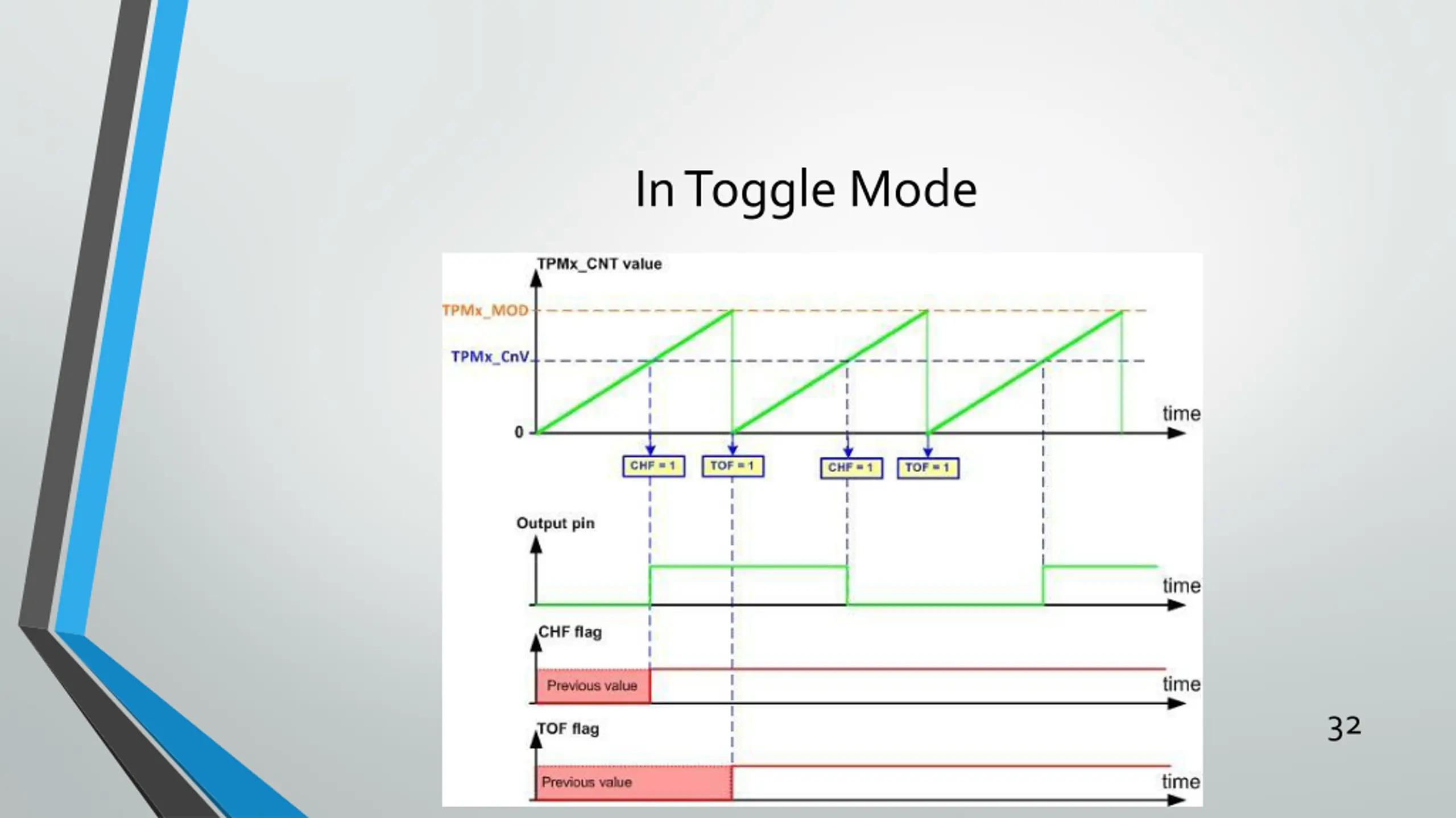Timer Status and Control (TPMx_SC) Register Field Bits Description PS 0 2 In the prescaler, the clock is divided by 2PS. CMOD 3 4 Clock Mode Selection CPWMS 5 Center-aligned PWM select (0: Up counter mode, 1: up-down counter mode). For generating delays use the Up counter mode. Time Overflow Interrupt Enable (0: Disabled, 1: Enabled). It is discussed in Chapter 6. Timer Overflow Flag TOIE 6 TOF 7 DMA 8 DMA Enable (0: Disabled, 1: Enabled) 22