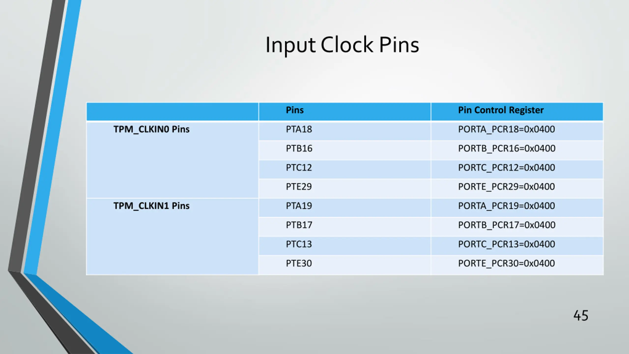 Input Clock Pins Pins Pin Control Register TPM_CLKIN0 Pins PTA18 PORTA_PCR18=0x0400 PTB16 PORTB_PCR16=0x0400 PTC12 PORTC_PCR12=0x0400 PTE29 PORTE_PCR29=0x0400 TPM_CLKIN1 Pins PTA19 PORTA_PCR19=0x0400 PTB17 PORTB_PCR17=0x0400 PTC13 PORTC_PCR13=0x0400 PTE30 PORTE_PCR30=0x0400 45