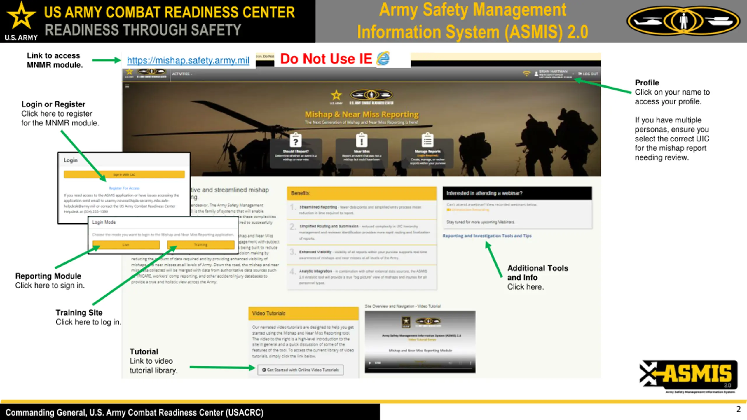 Army Safety Management Information System (ASMIS) 2.0 US ARMY COMBAT READINESS CENTER READINESS THROUGH SAFETY Do Not Use IE Link to access MNMR module. https://mishap.safety.army.mil Profile Click on your name to access your profile. Login or Register Click here to register for the MNMR module. If you have multiple personas, ensure you select the correct UIC for the mishap report needing review. Additional Tools and Info Click here. Reporting Module Click here to sign in. Training Site Click here to log in. Tutorial Link to video tutorial library. 2 Commanding General, U.S. Army Combat Readiness Center (USACRC)