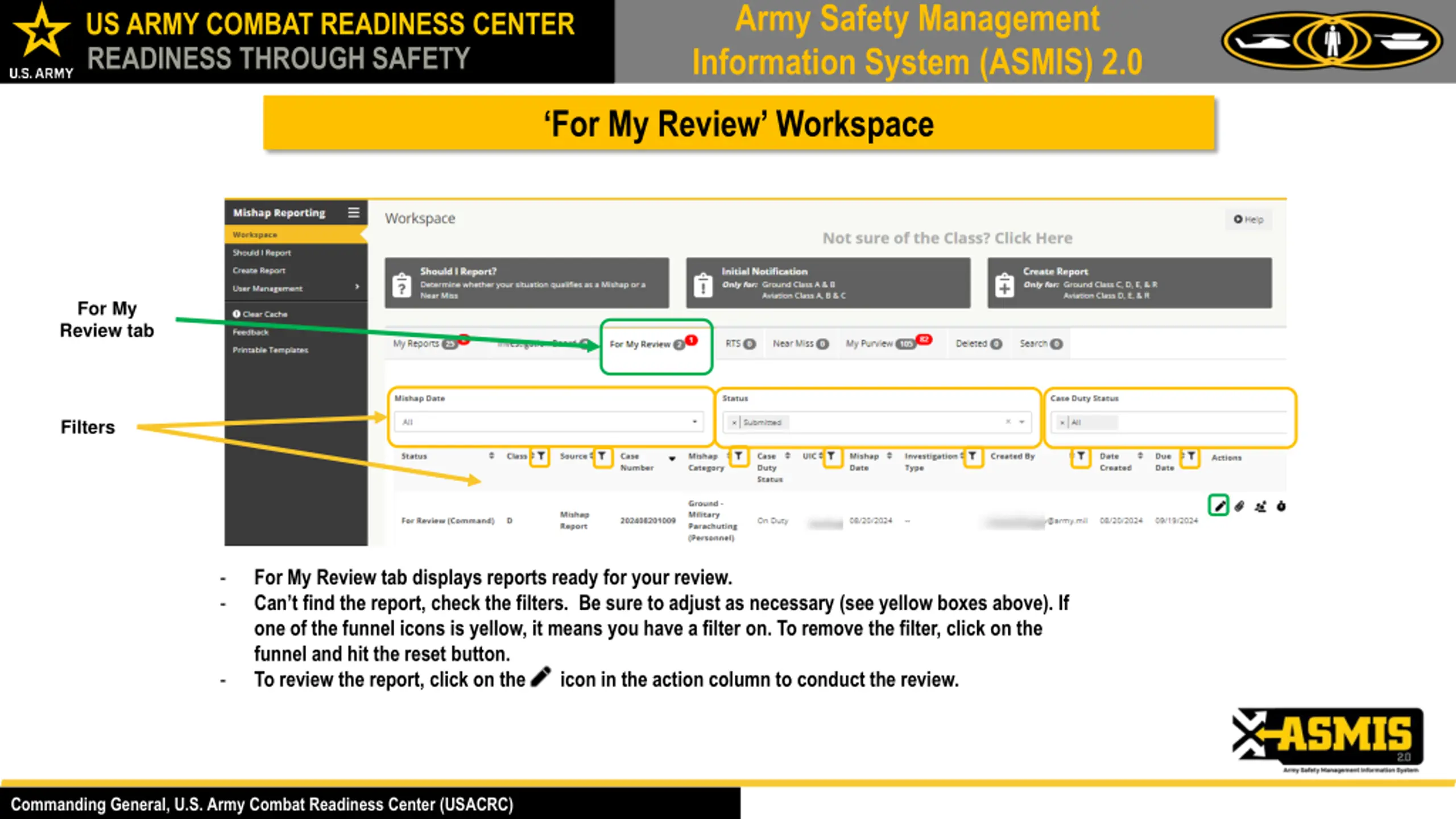 Army Safety Management Information System (ASMIS) 2.0 US ARMY COMBAT READINESS CENTER READINESS THROUGH SAFETY For My Review Workspace For My Review tab Filters - - For My Review tab displays reports ready for your review. Can t find the report, check the filters. Be sure to adjust as necessary (see yellow boxes above). If one of the funnel icons is yellow, it means you have a filter on. To remove the filter, click on the funnel and hit the reset button. To review the report, click on the icon in the action column to conduct the review. - Commanding General, U.S. Army Combat Readiness Center (USACRC)