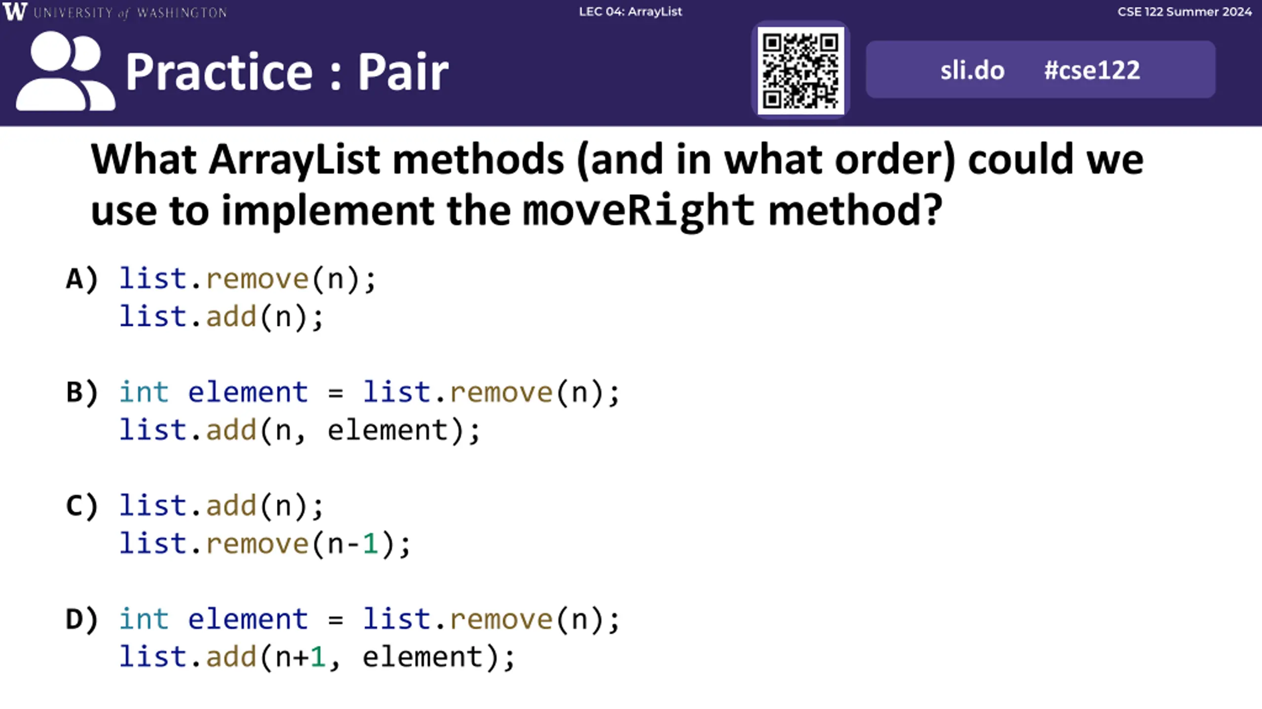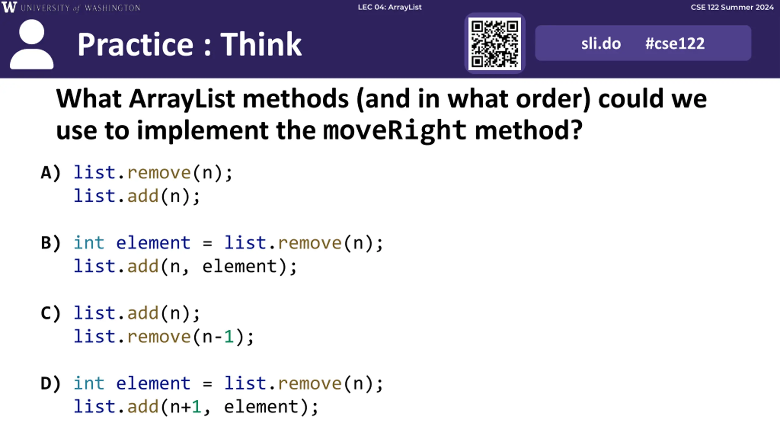 LEC 04: ArrayList CSE 122 Summer 2024 Practice : Pair sli.do #cse122 What ArrayList methods (and in what order) could we use to implement the moveRight method? A) list.remove(n); list.add(n); B) int element = list.remove(n); list.add(n, element); C) list.add(n); list.remove(n-1); D) int element = list.remove(n); list.add(n+1, element);