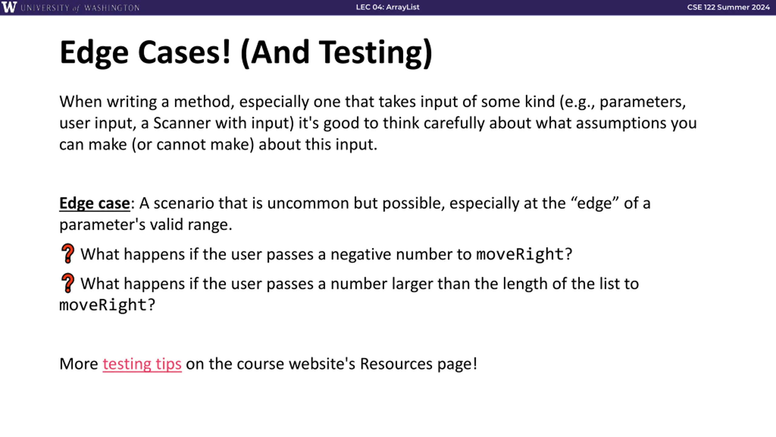 LEC 04: ArrayList CSE 122 Summer 2024 Edge Cases! (And Testing) When writing a method, especially one that takes input of some kind (e.g., parameters, user input, a Scanner with input) it's good to think carefully about what assumptions you can make (or cannot make) about this input. Edge case: A scenario that is uncommon but possible, especially at the edge of a parameter's valid range. What happens if the user passes a negative number to moveRight? What happens if the user passes a number larger than the length of the list to moveRight? More testing tips on the course website's Resources page!