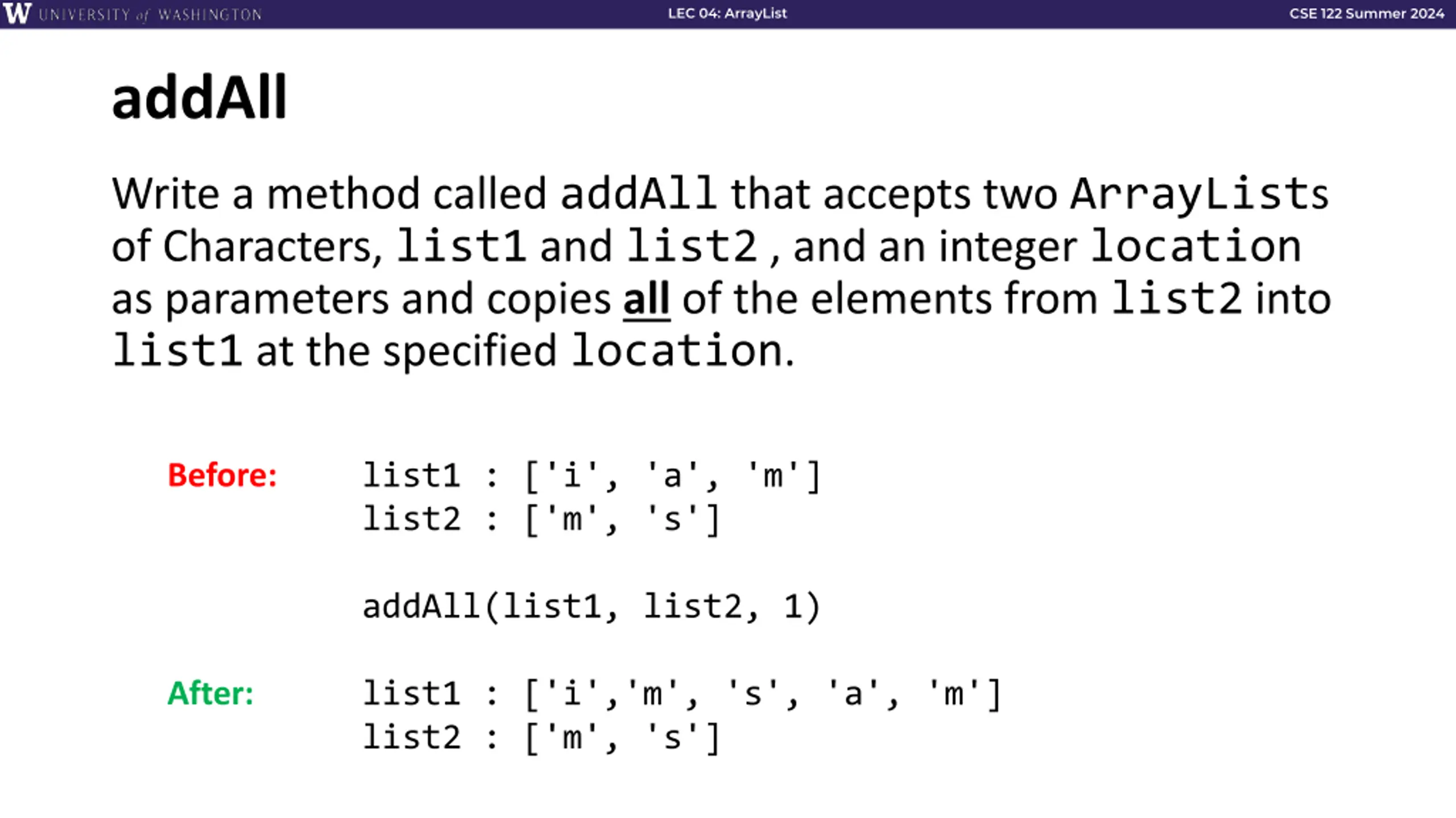 LEC 04: ArrayList CSE 122 Summer 2024 addAll Write a method called addAll that accepts two ArrayLists of Characters, list1 and list2 , and an integer location as parameters and copies all of the elements from list2 into list1 at the specified location. Before: list1 : ['i', 'a', 'm'] list2 : ['m', 's'] addAll(list1, list2, 1) After: list1 : ['i','m', 's', 'a', 'm'] list2 : ['m', 's']