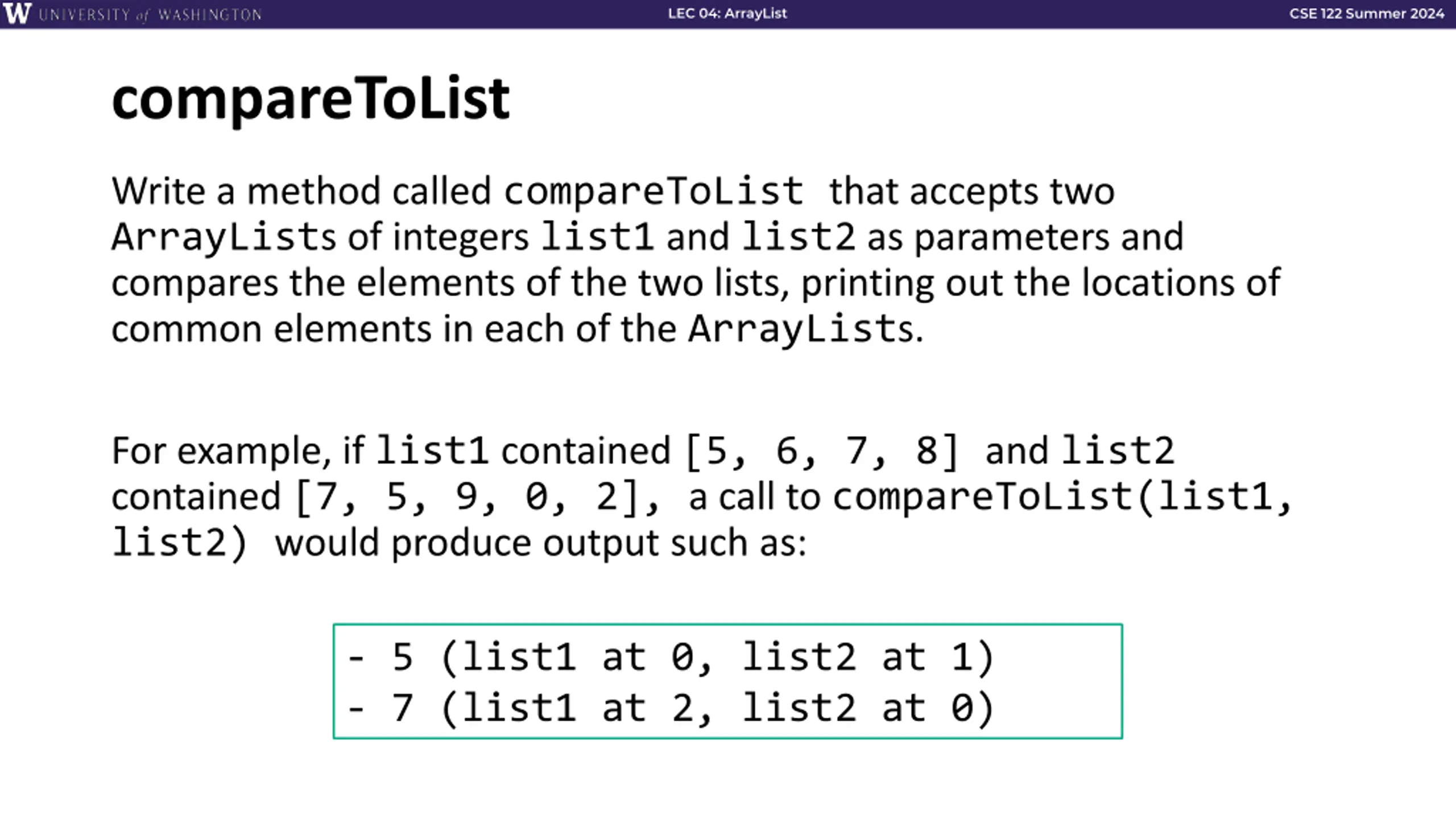 LEC 04: ArrayList CSE 122 Summer 2024 Practice : Pair sli.do #cse122 Spend 2 min discussing about how you would implement this method with a neighbor! Submit a short pseudocode of your answer Write a method called compareToList that accepts two ArrayLists of integers list1 and list2 as parameters and compares the elements of the two lists, printing out the locations of common elements in each of the ArrayLists. For example, if list1 contained [5, 6, 7, 8] and list2 contained [7, 5, 9, 0, 2], a call to compareToList(list1, list2) would produce output such as: - 5 (list1 at 0, list2 at 1) - 7 (list1 at 2, list2 at 0)
