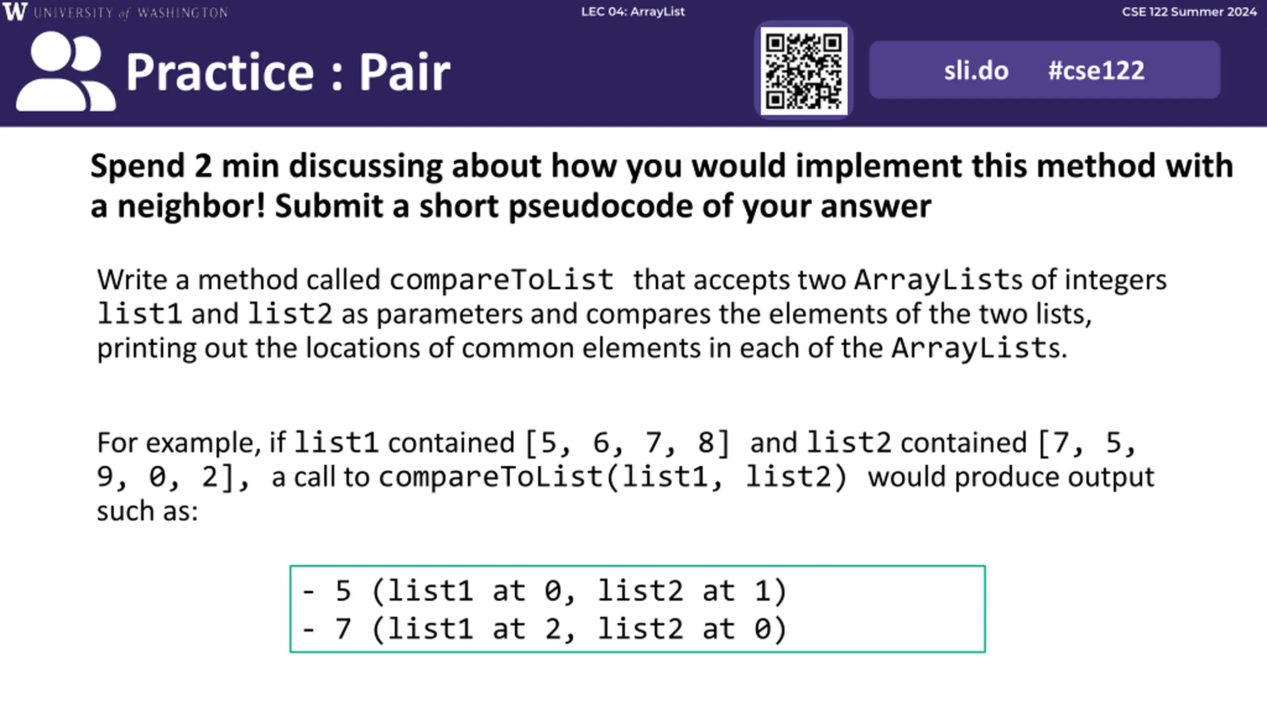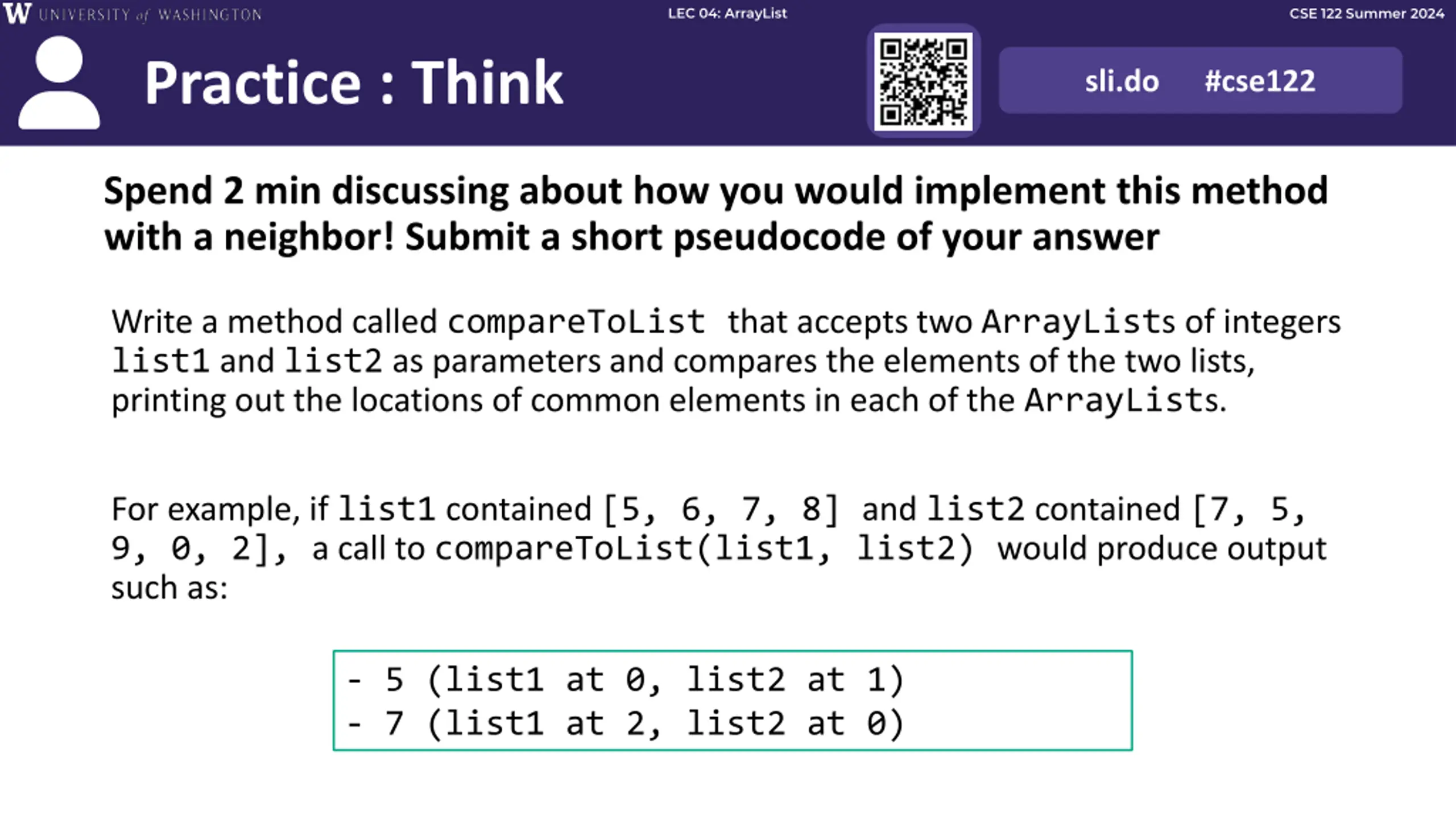 LEC 04: ArrayList CSE 122 Summer 2024 Practice : Think sli.do #cse122 Spend 2 min discussing about how you would implement this method with a neighbor! Submit a short pseudocode of your answer Write a method called compareToList that accepts two ArrayLists of integers list1 and list2 as parameters and compares the elements of the two lists, printing out the locations of common elements in each of the ArrayLists. For example, if list1 contained [5, 6, 7, 8] and list2 contained [7, 5, 9, 0, 2], a call to compareToList(list1, list2) would produce output such as: - 5 (list1 at 0, list2 at 1) - 7 (list1 at 2, list2 at 0)