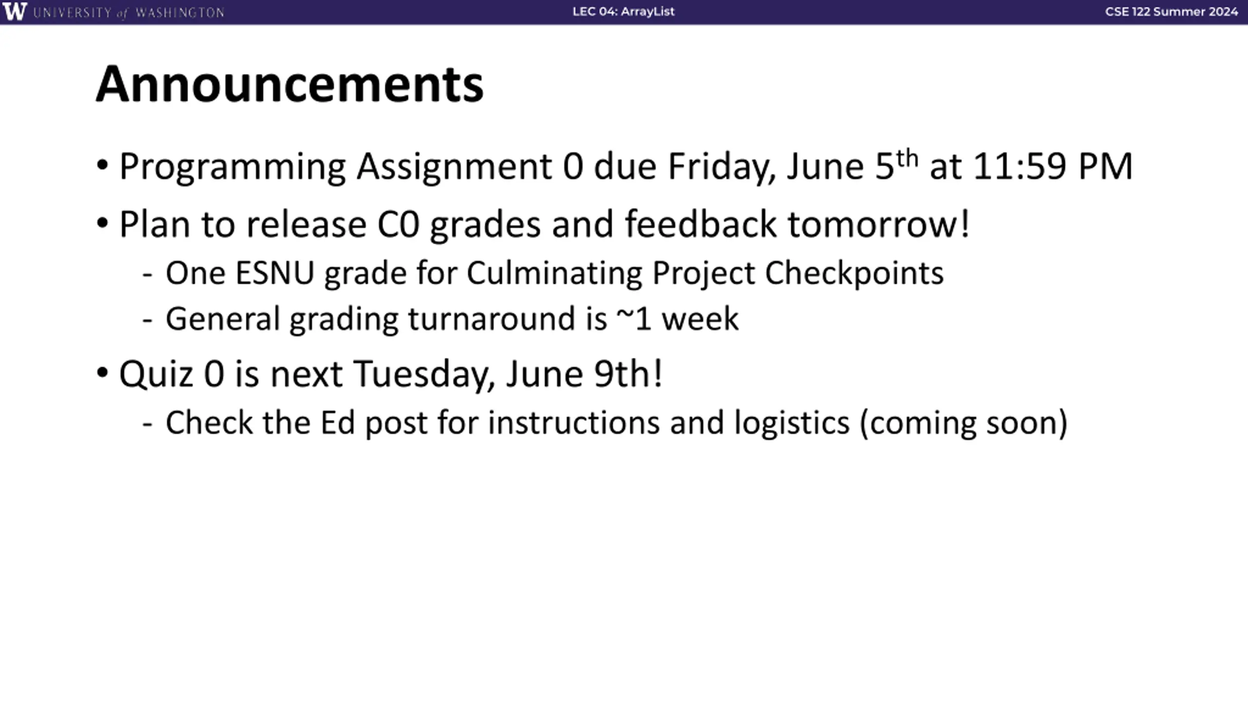 LEC 04: ArrayList CSE 122 Summer 2024 Announcements Programming Assignment 0 due Friday, June 5th at 11:59 PM Plan to release C0 grades and feedback tomorrow! - One ESNU grade for Culminating Project Checkpoints - General grading turnaround is ~1 week Quiz 0 is next Tuesday, June 9th! - Check the Ed post for instructions and logistics (coming soon)