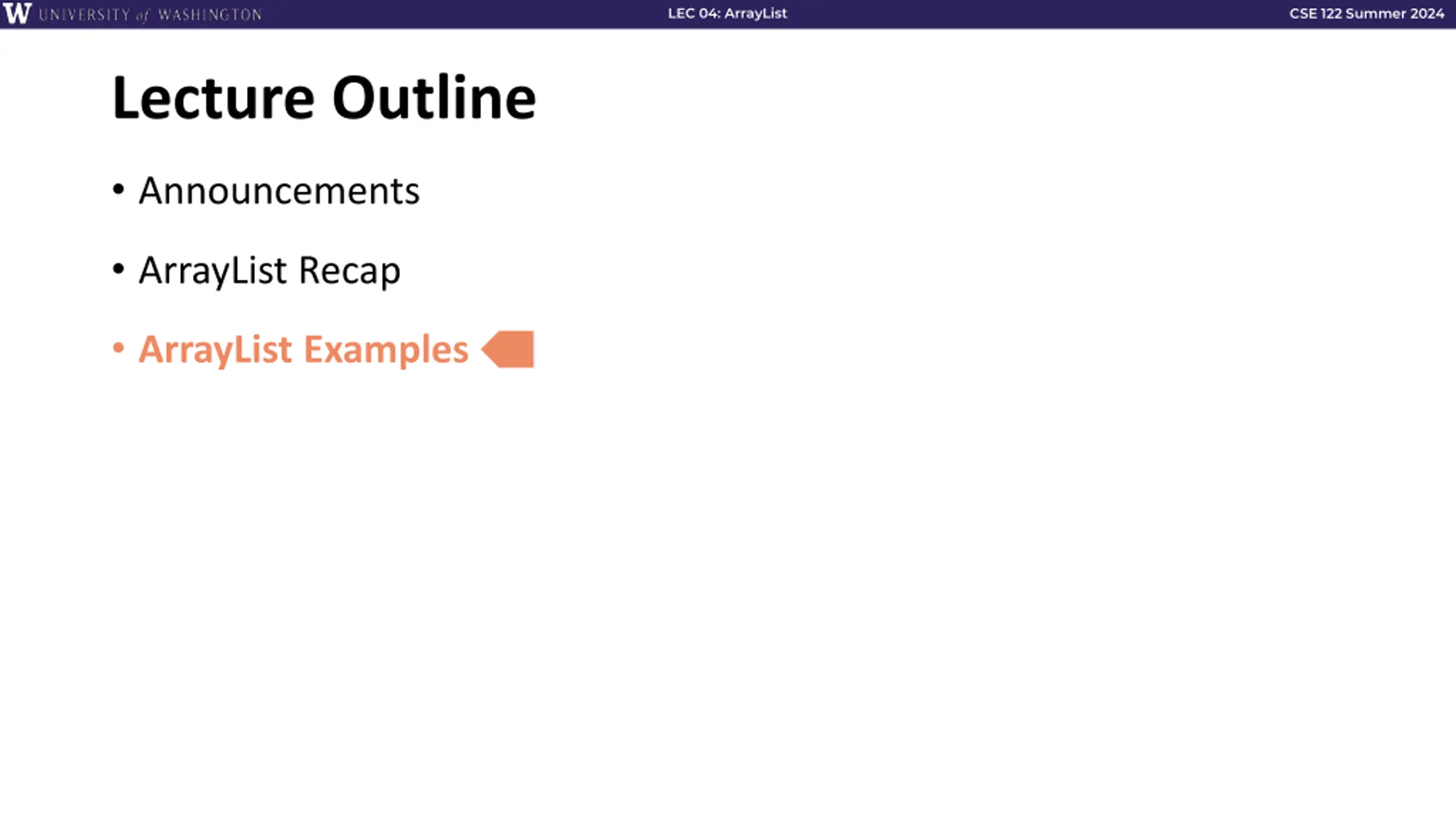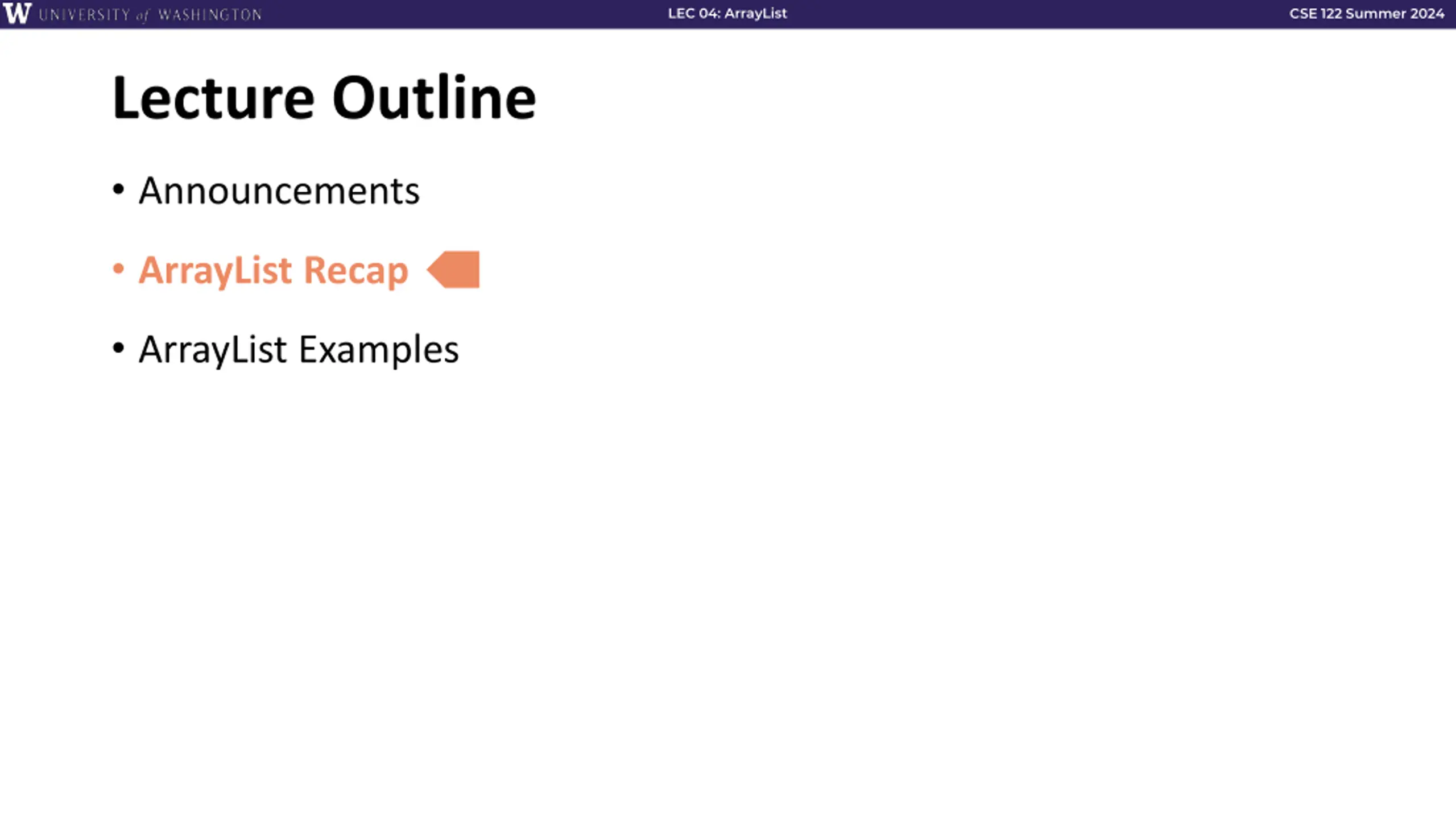 LEC 04: ArrayList CSE 122 Summer 2024 Lecture Outline Announcements ArrayList Recap ArrayList Examples
