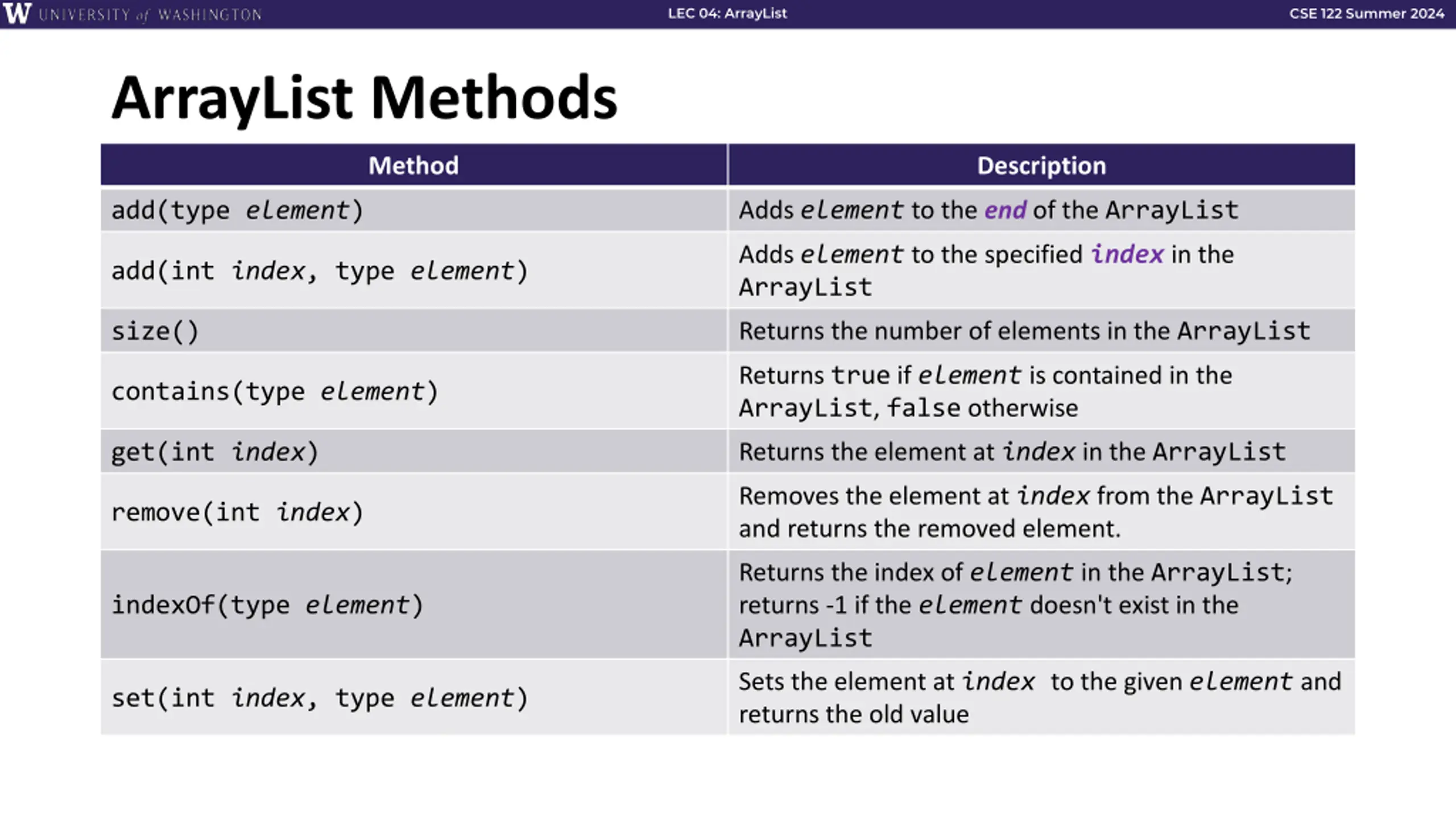 LEC 04: ArrayList CSE 122 Summer 2024 ArrayList Methods Method Description Adds elementto the end of the ArrayList add(type element) Adds elementto the specified indexin the ArrayList add(int index, type element) Returns the number of elements in the ArrayList size() Returns true if elementis contained in the ArrayList, false otherwise contains(type element) Returns the element at indexin the ArrayList get(int index) Removes the element at index from the ArrayList and returns the removed element. remove(int index) Returns the index of elementin the ArrayList; returns -1 if the elementdoesn't exist in the ArrayList indexOf(type element) Sets the element at index to the given element and returns the old value set(int index, type element)