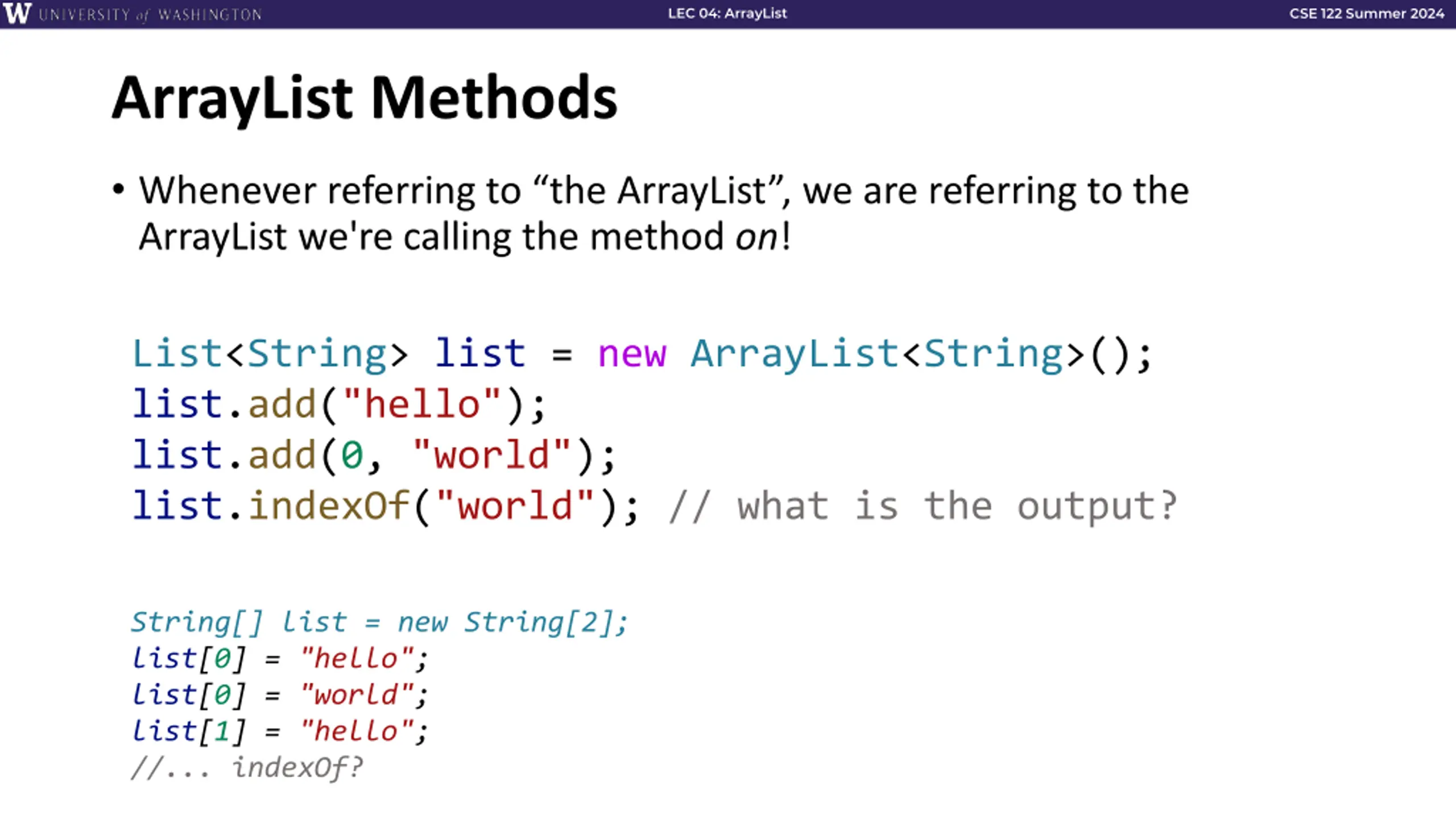 LEC 04: ArrayList CSE 122 Summer 2024 ArrayList Methods Whenever referring to the ArrayList , we are referring to the ArrayList we're calling the method on! List<String> list = new ArrayList<String>(); list.add("hello"); list.add(0, "world"); list.indexOf("world"); // what is the output? String[] list = new String[2]; list[0] = "hello"; list[0] = "world"; list[1] = "hello"; //... indexOf?