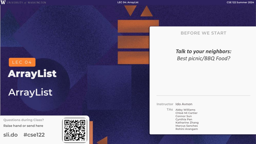 LEC 04: ArrayList CSE 122 Summer 2024 BEFORE WE START Talk to your neighbors: Best picnic/BBQ Food? LEC 04 ArrayList ArrayList ArrayList Instructor Ido Avnon TAs Abby Williams Chlo Mi Cartier Connor Sun Cynthia Pan Katharine Zhang Marcus Sanches Rohini Arangam Questions during Class? Raise hand or send here sli.do #cse122