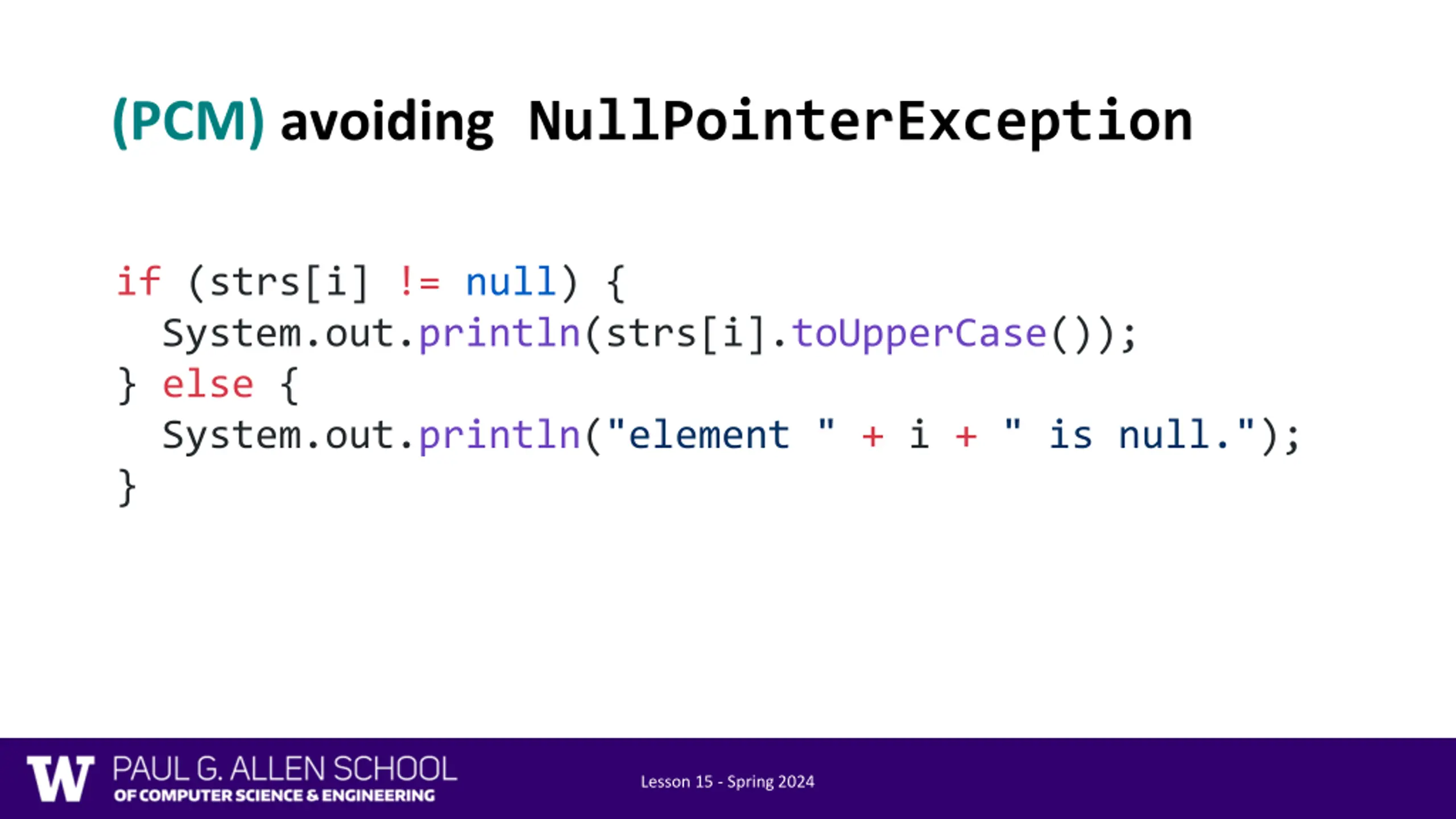 (PCM) avoiding NullPointerException if (strs[i] != null) { System.out.println(strs[i].toUpperCase()); } else { System.out.println("element " + i + " is null."); } Lesson 15 - Spring 2024